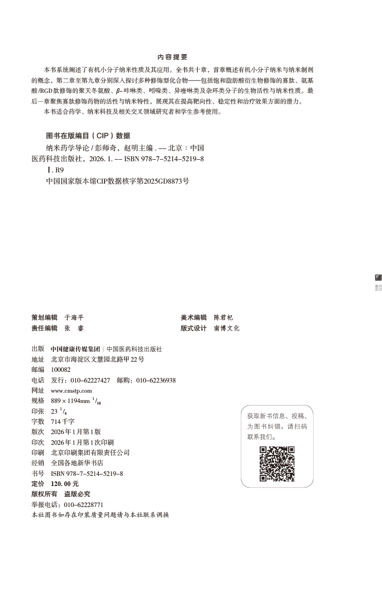纳米药学导论 彭师奇 赵明 主编 本书适合药学、纳米科技及相关交叉领域研究者和学生参考使用 9787521452198 中国医药科技出版社