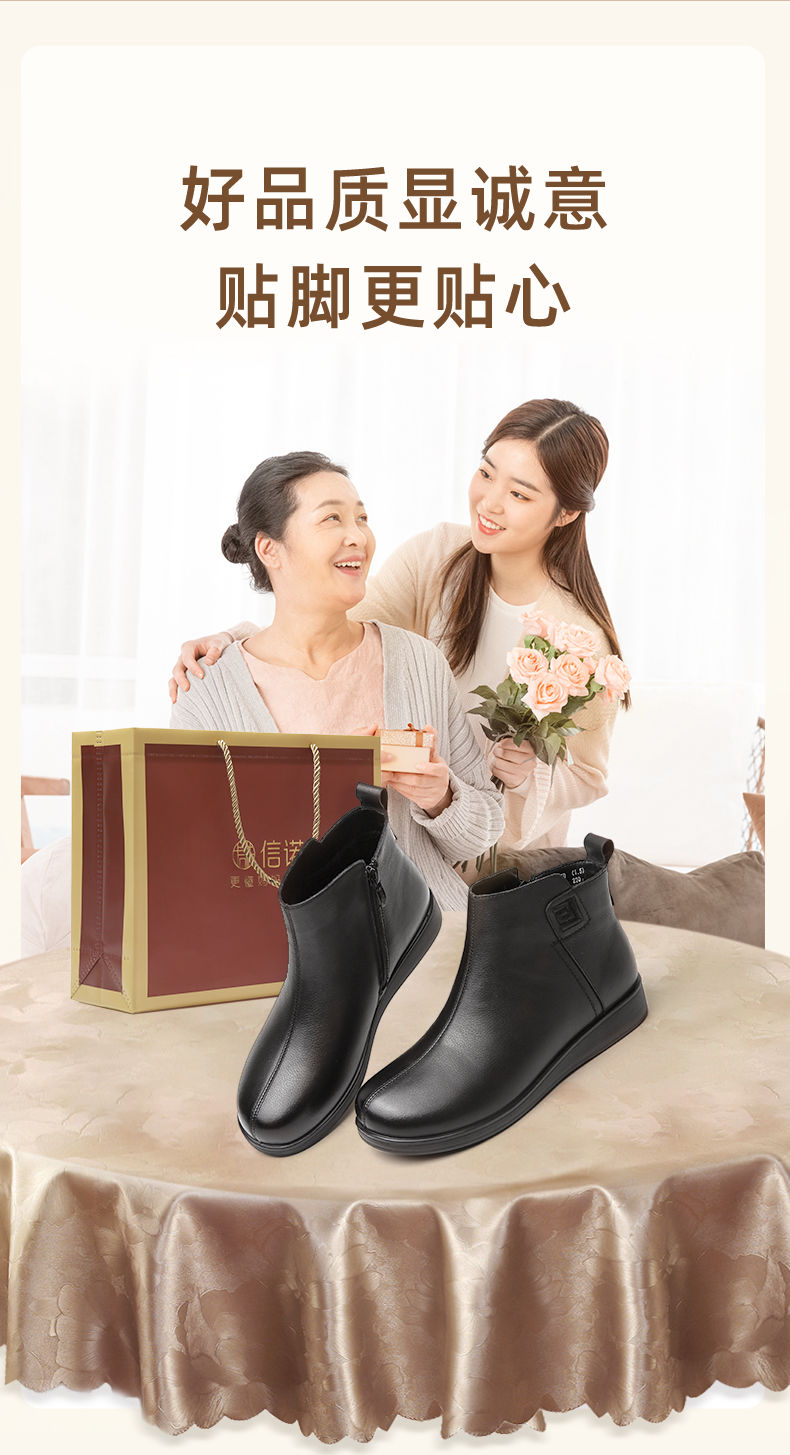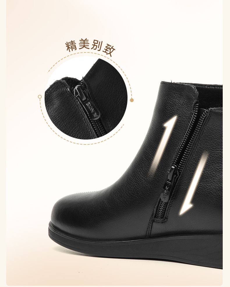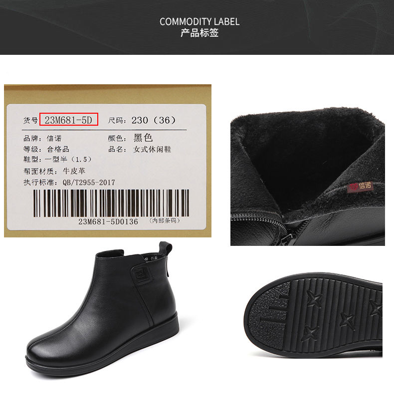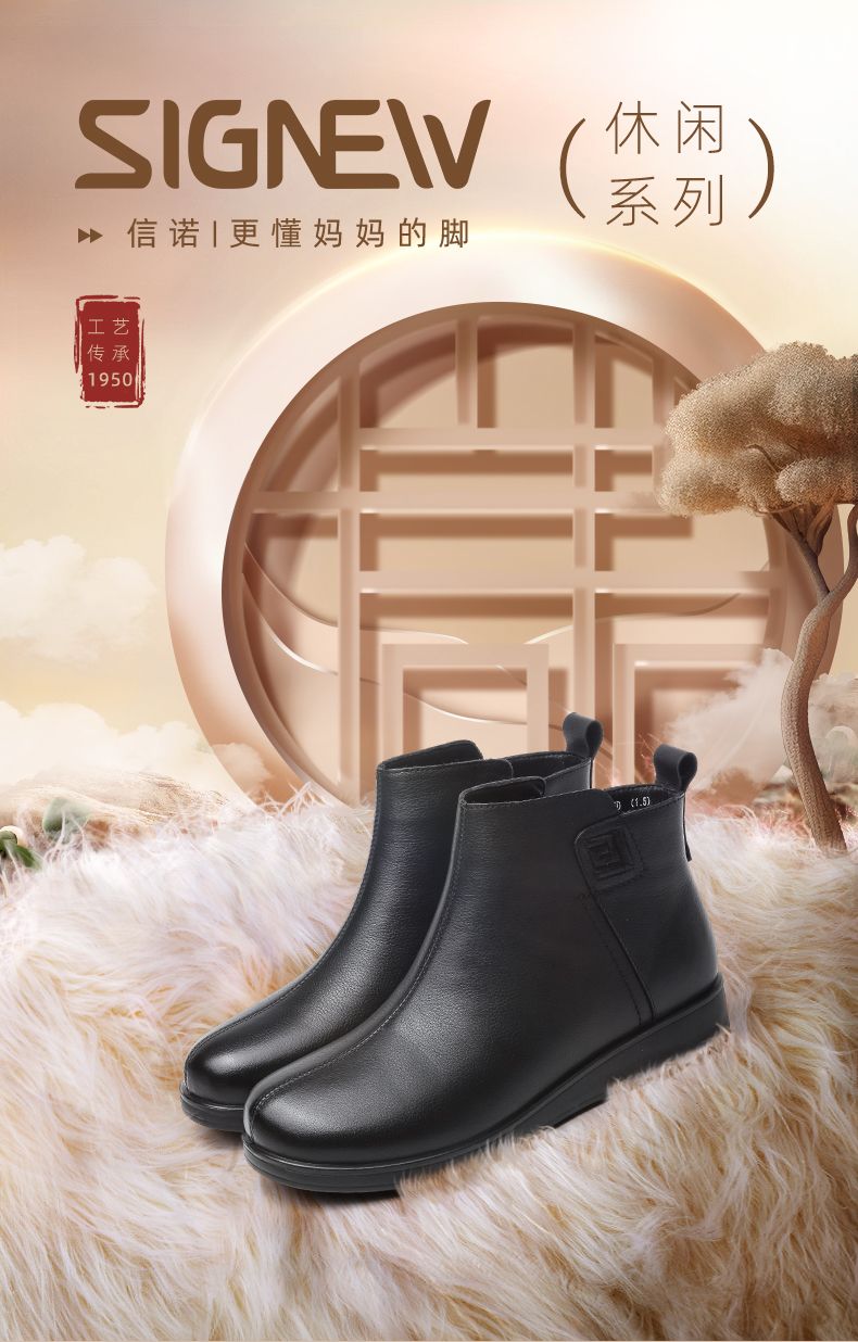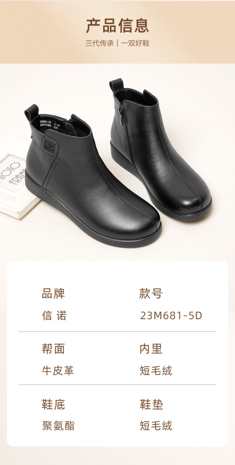 信诺真皮加绒妈妈鞋秋冬季中老年皮鞋女平底防滑软底老人奶奶棉鞋23M681-5D