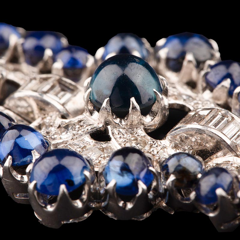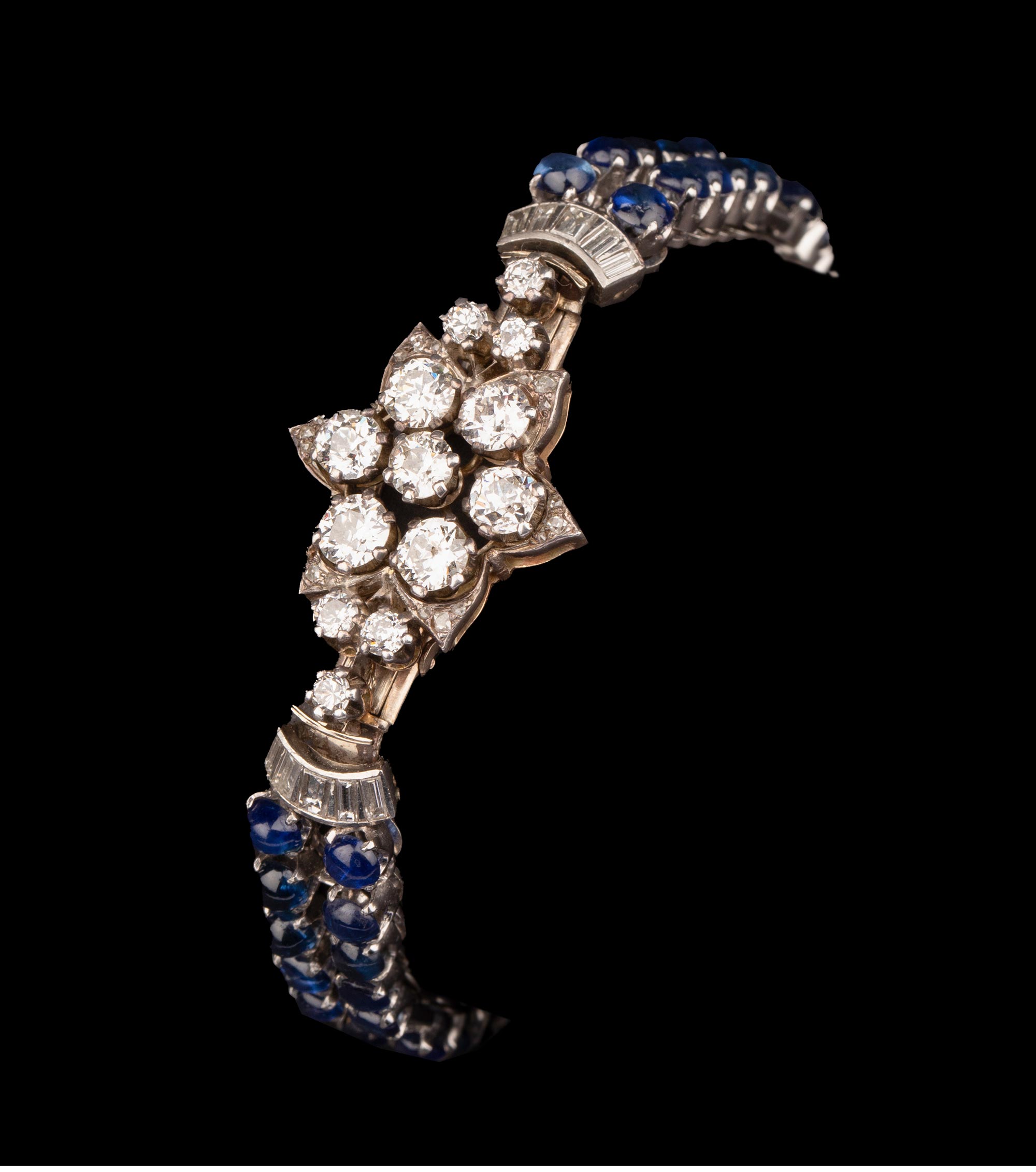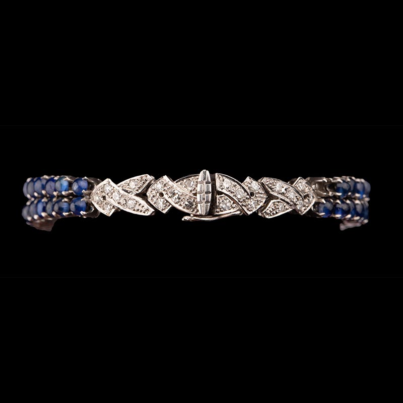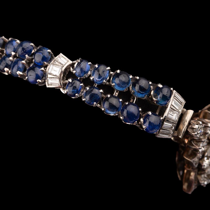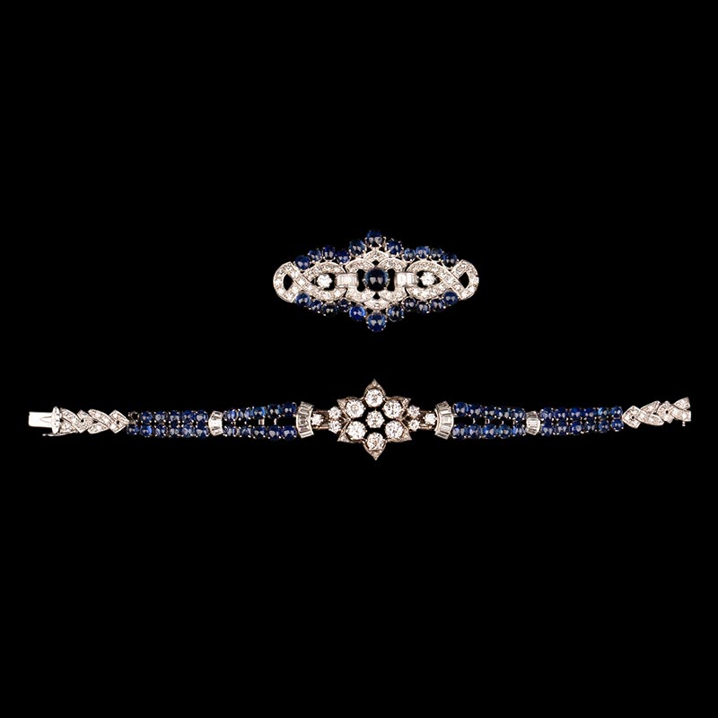 1940-1950年代澳大利亚出品珠串花缎造型铂金白金镶嵌蓝宝石及钻石可替换式手链套件