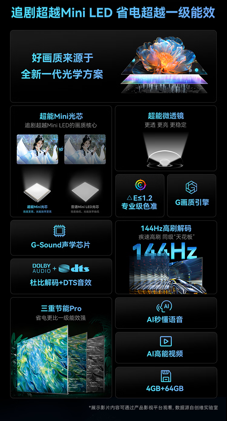 创维55G3F追剧超越MiniLED 二级节能4+64G 超能Mini光芯三重节能 四重护眼144Hz高刷护眼 智能投屏 55英寸 2025款新品