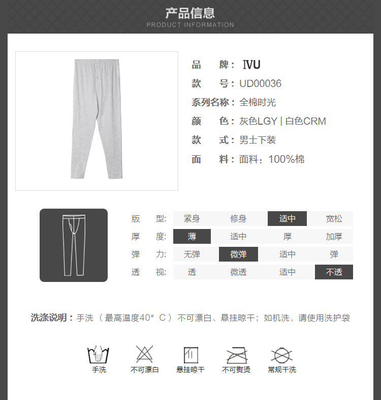 6F IVU男士秋季薄款纯棉暖裤无痕舒适打底棉毛裤