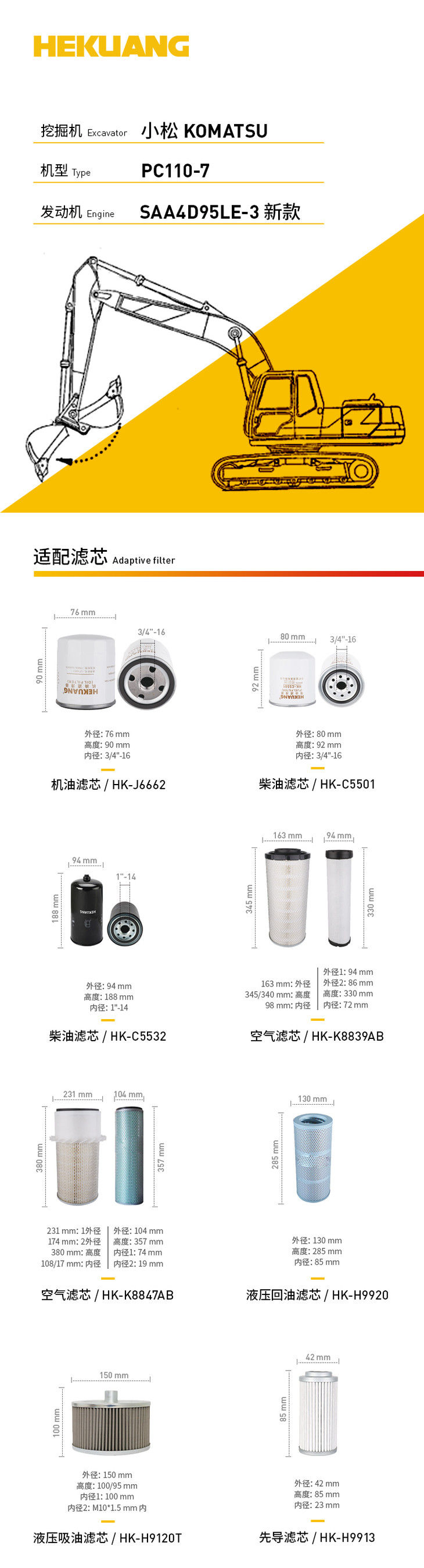 KOMATSU小松PC110-7(小松SAA4D95LE-3发动机)挖掘机滤芯 机油柴油空气滤芯 液压油先导滤芯