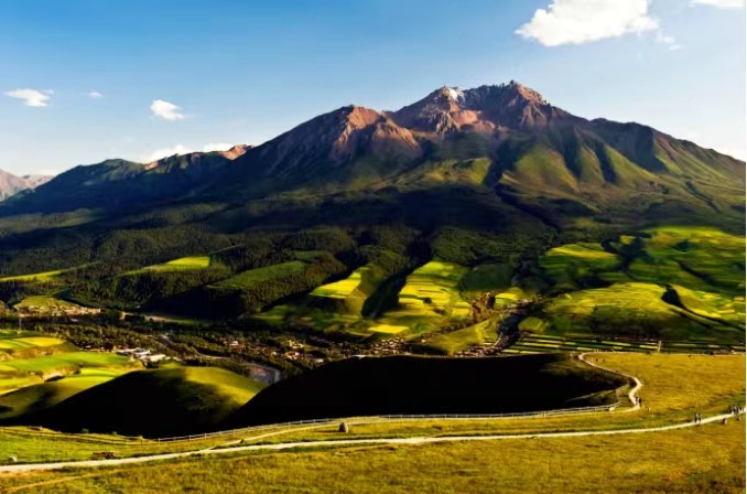 作为祁连的象征,牛心山巍峨高耸,坡脚金黄的油菜花与碧绿的草原、坡中墨绿色的林海、坡顶皑皑雪山交错,极富层次感。