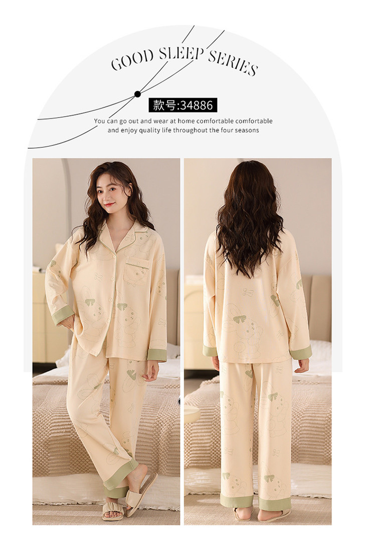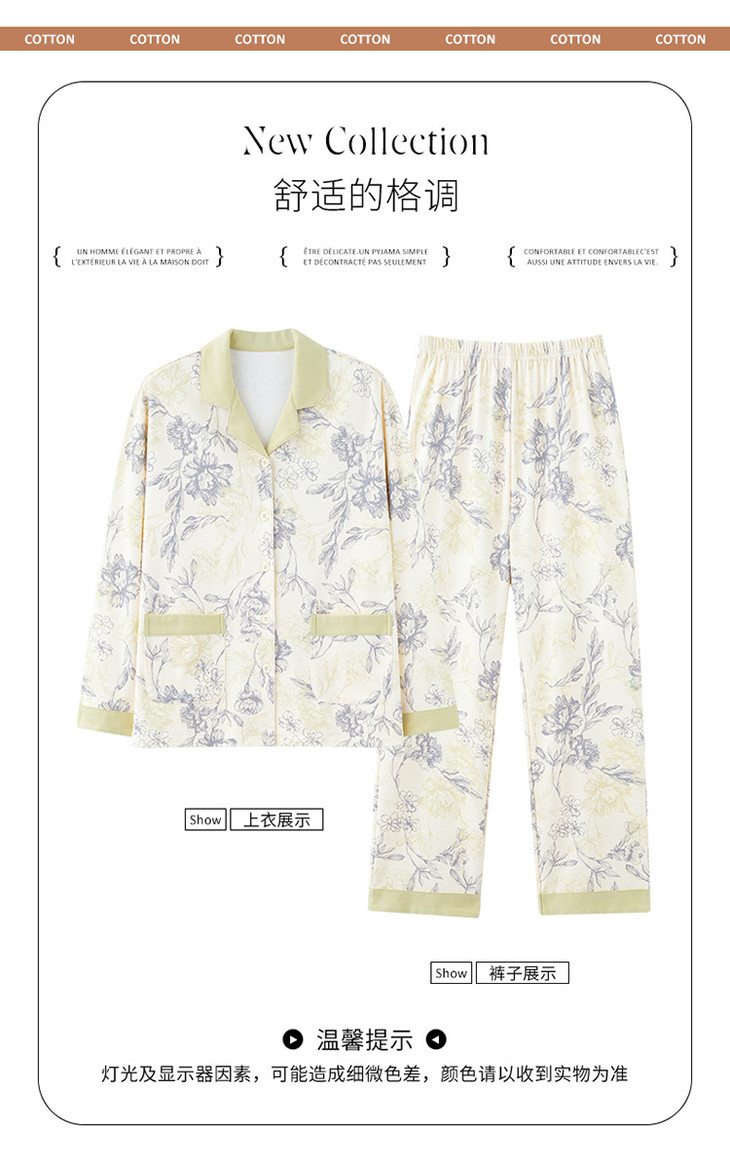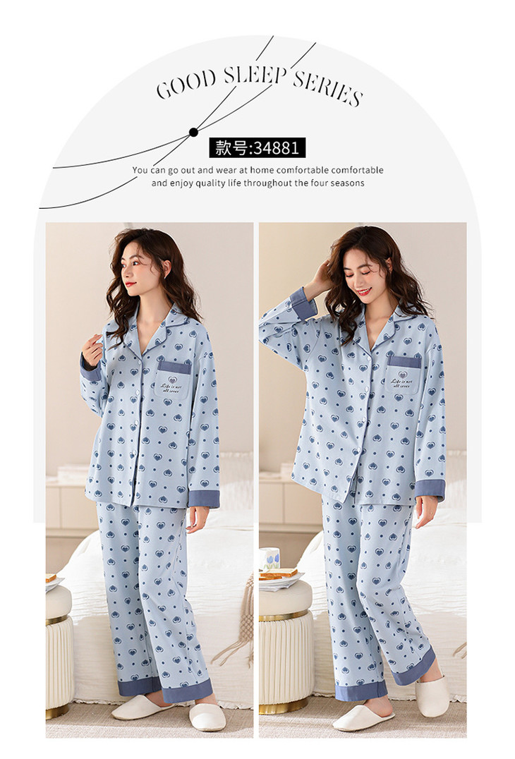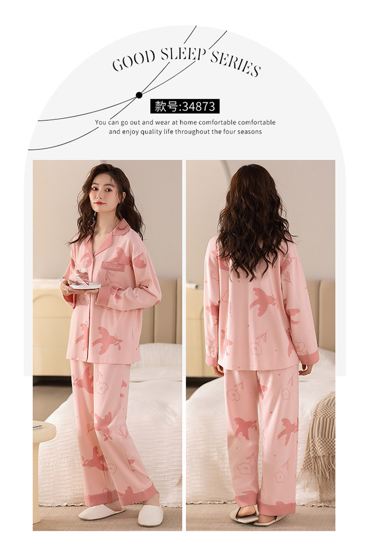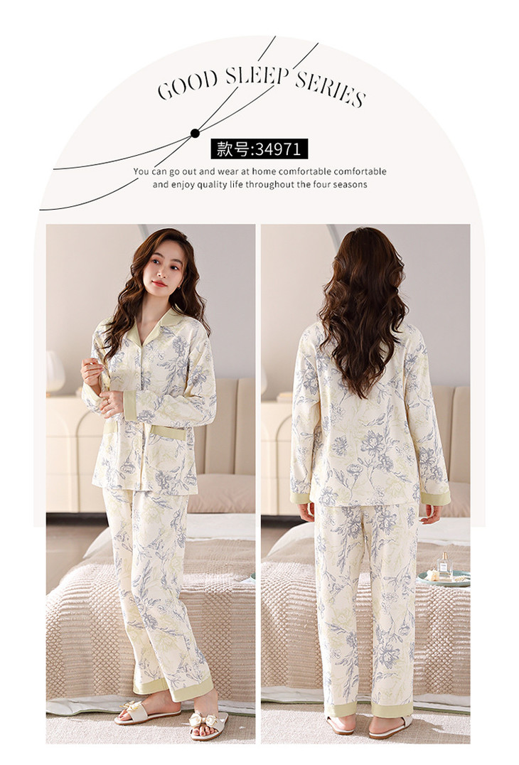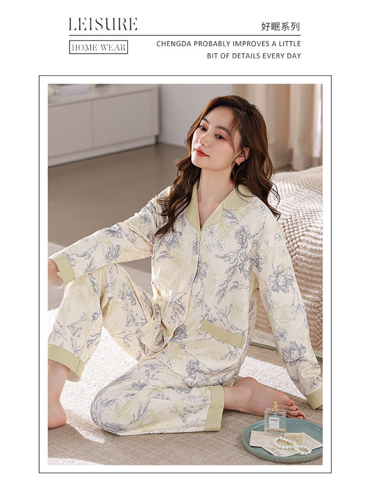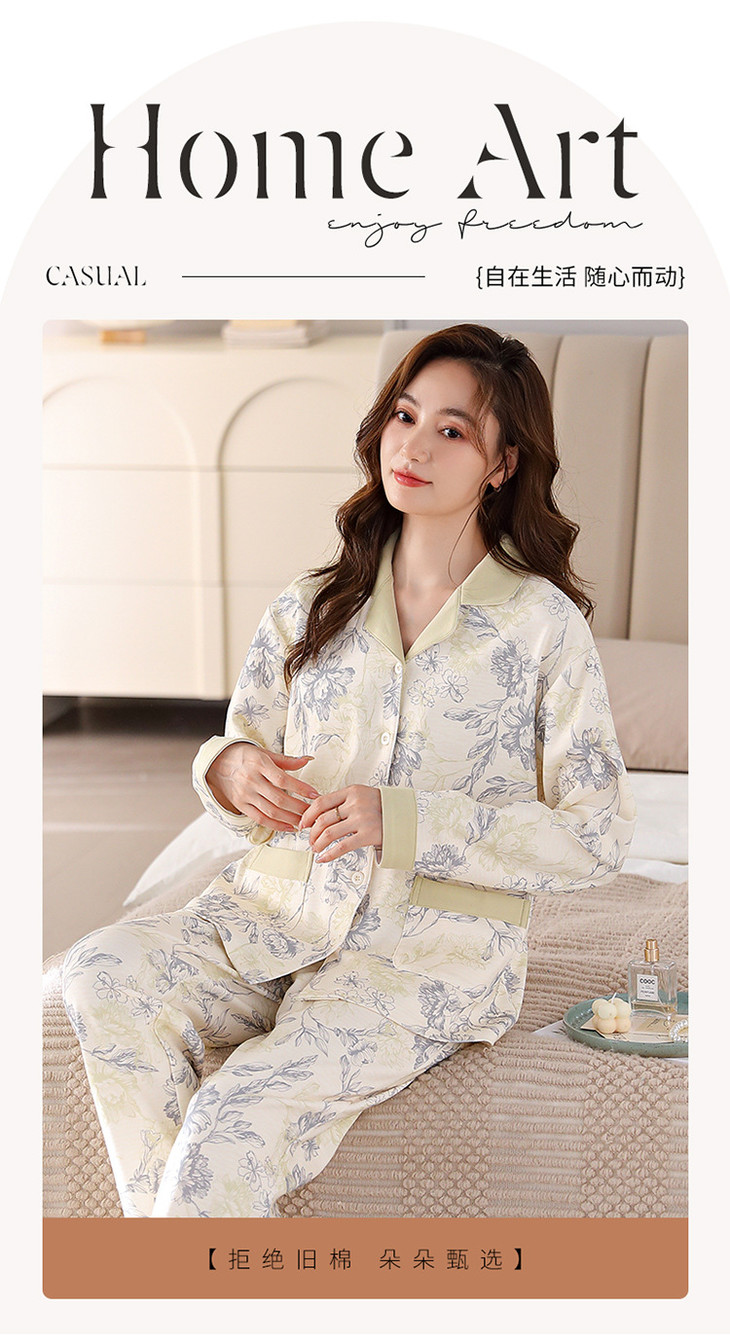 高档纯棉睡衣长袖开衫春秋款家居服大码套装