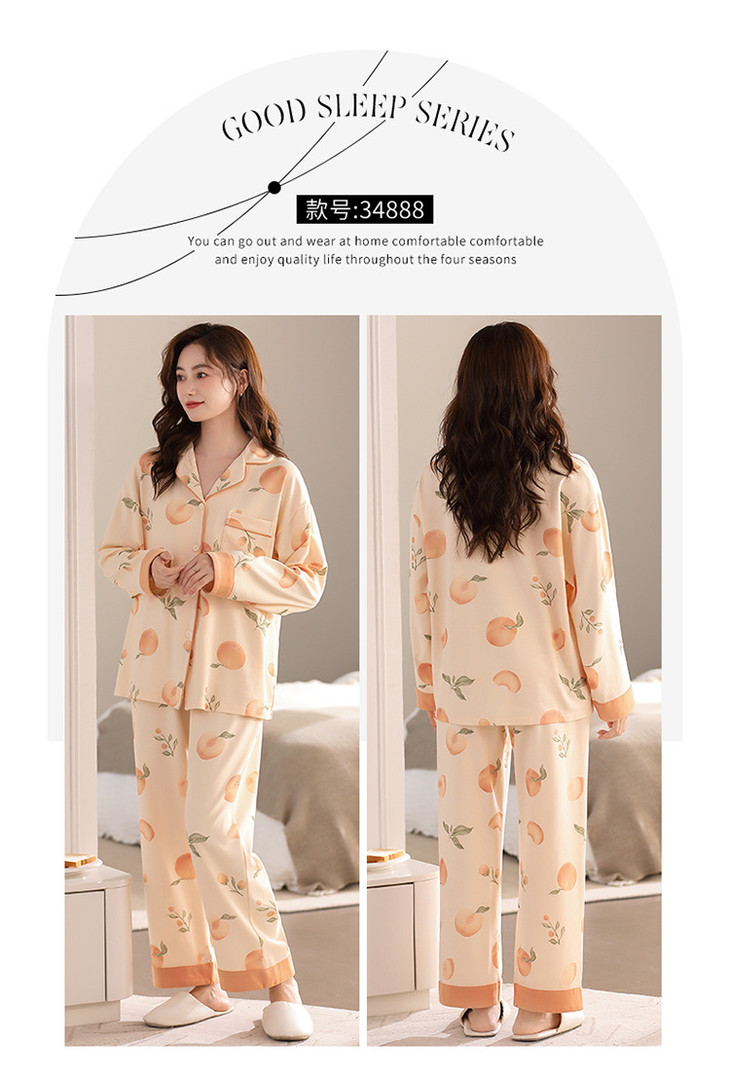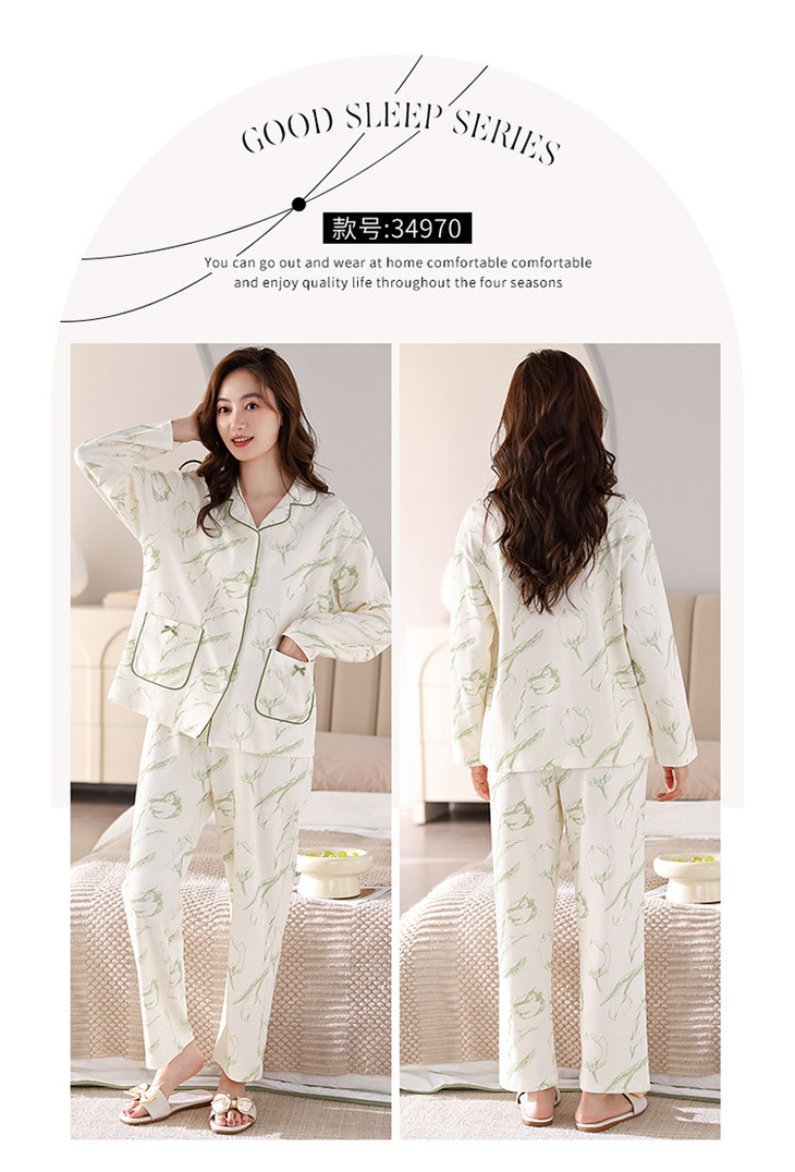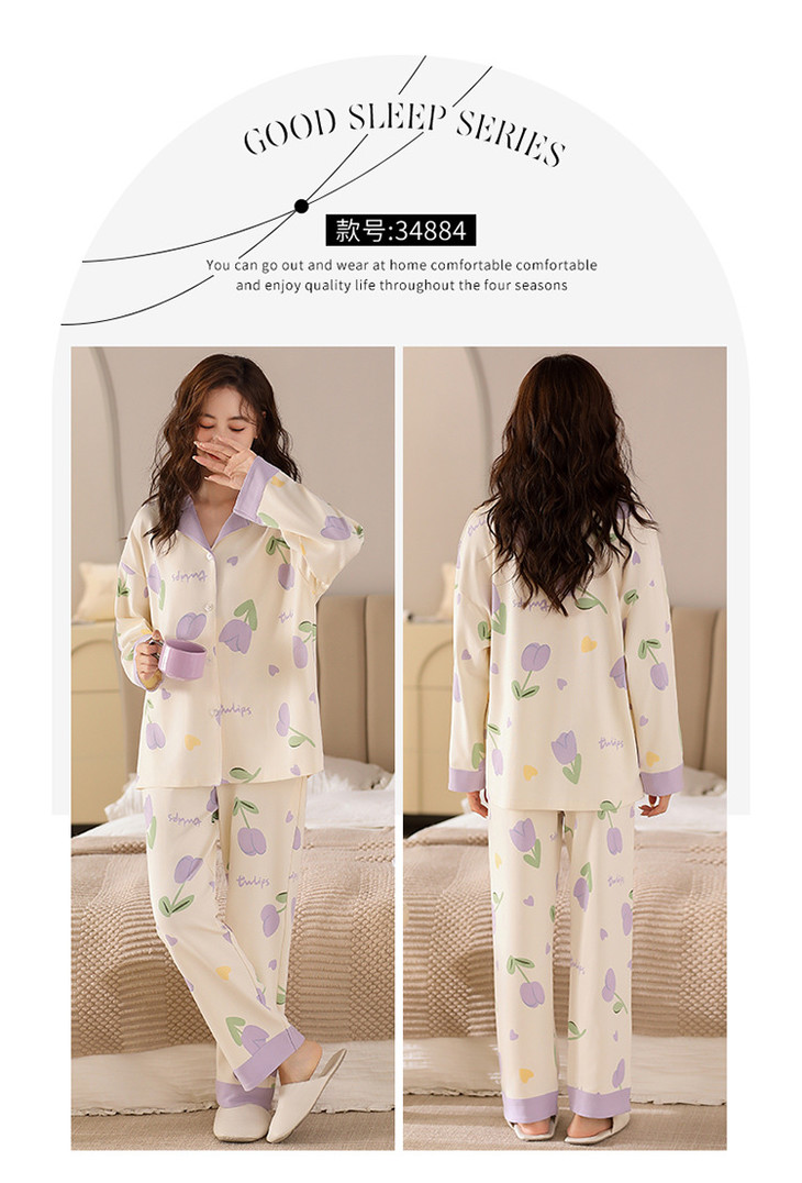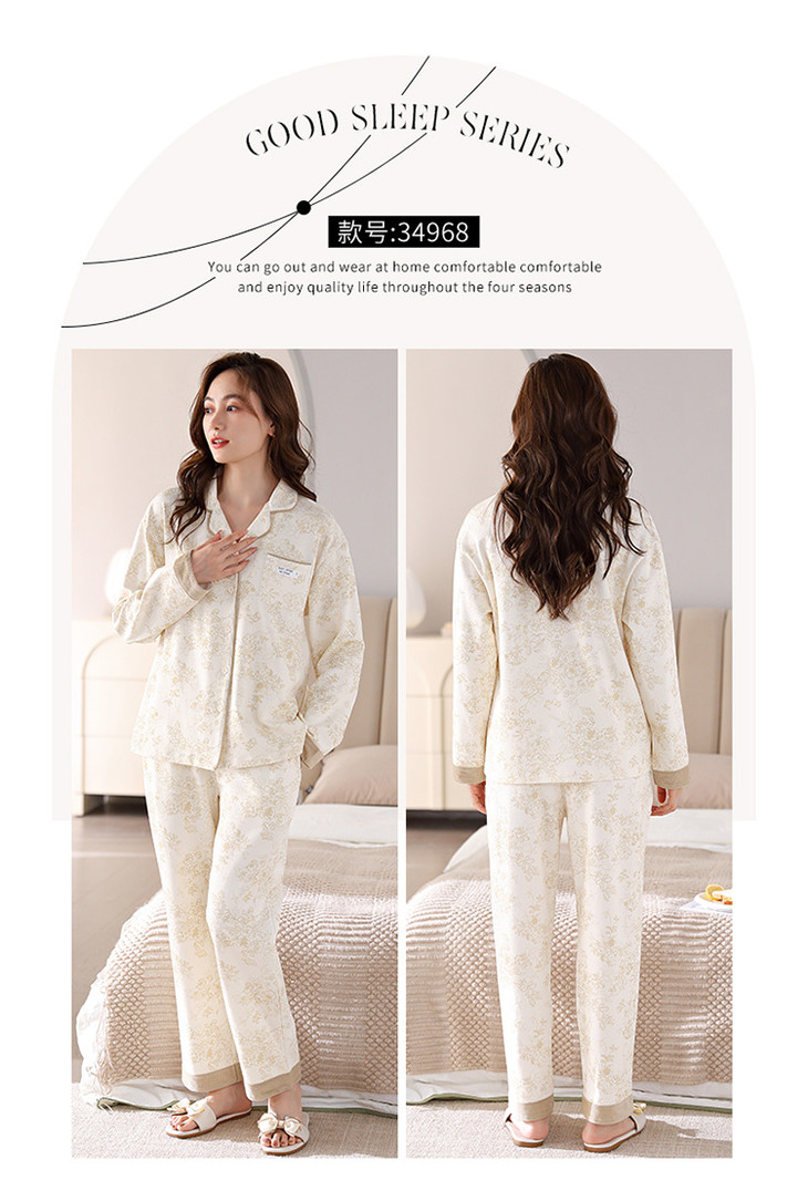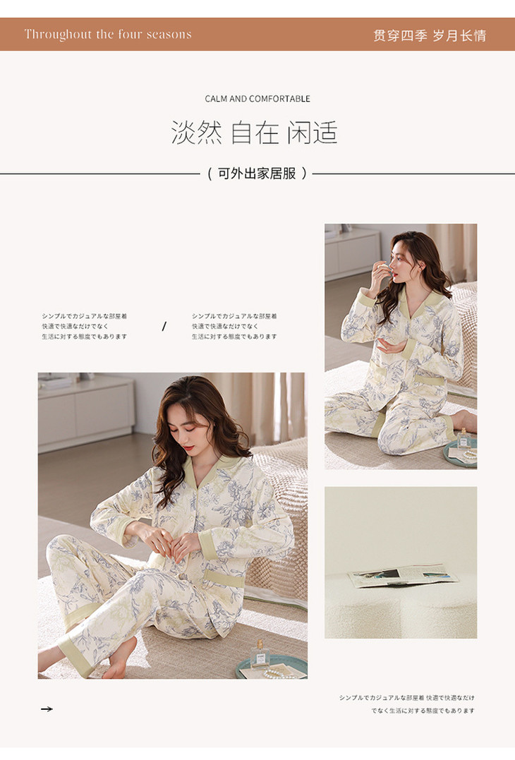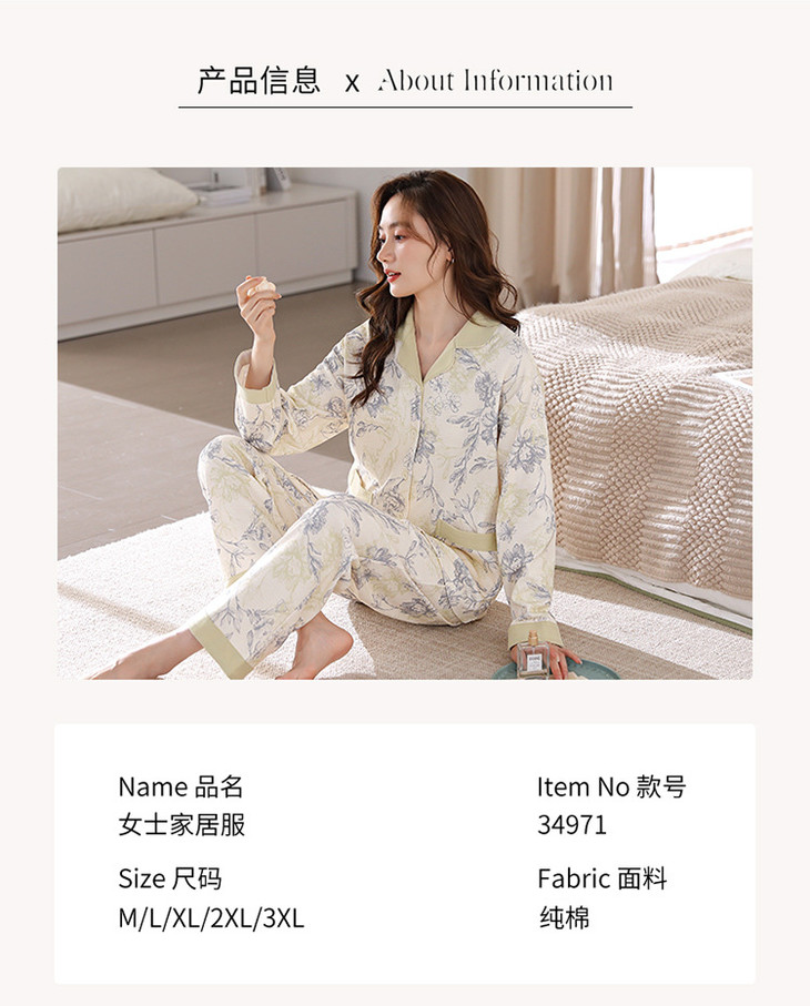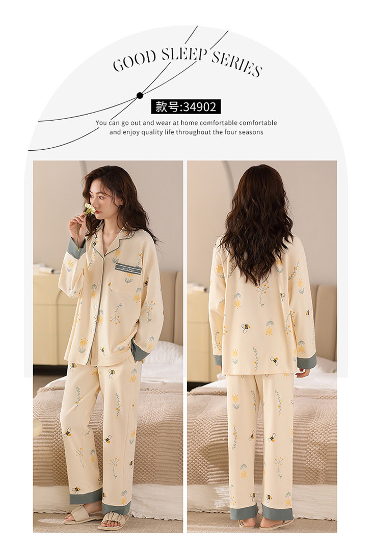 高档纯棉睡衣长袖开衫春秋款家居服大码套装