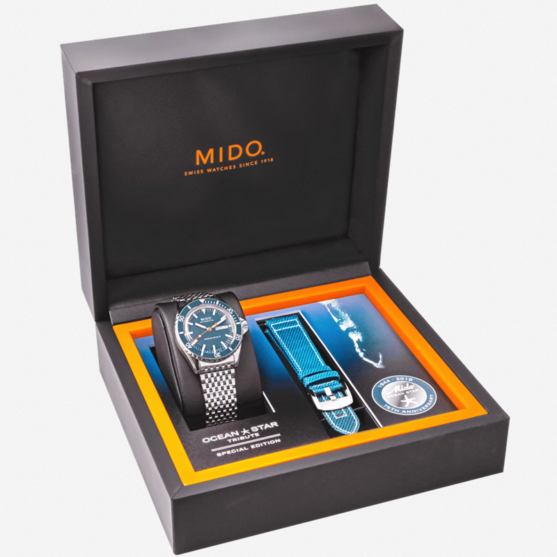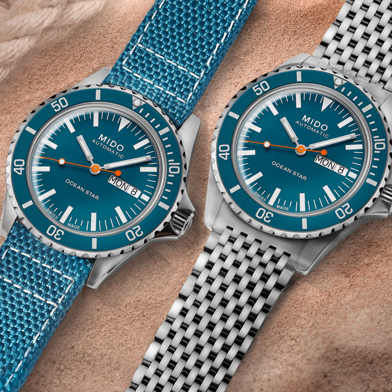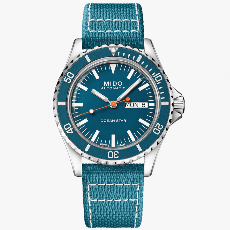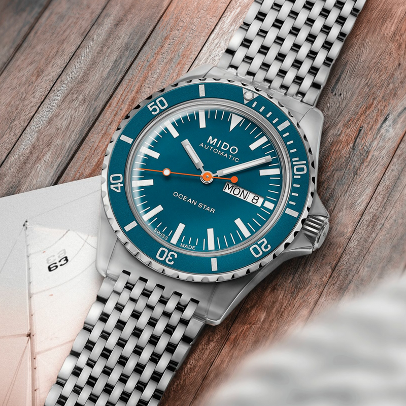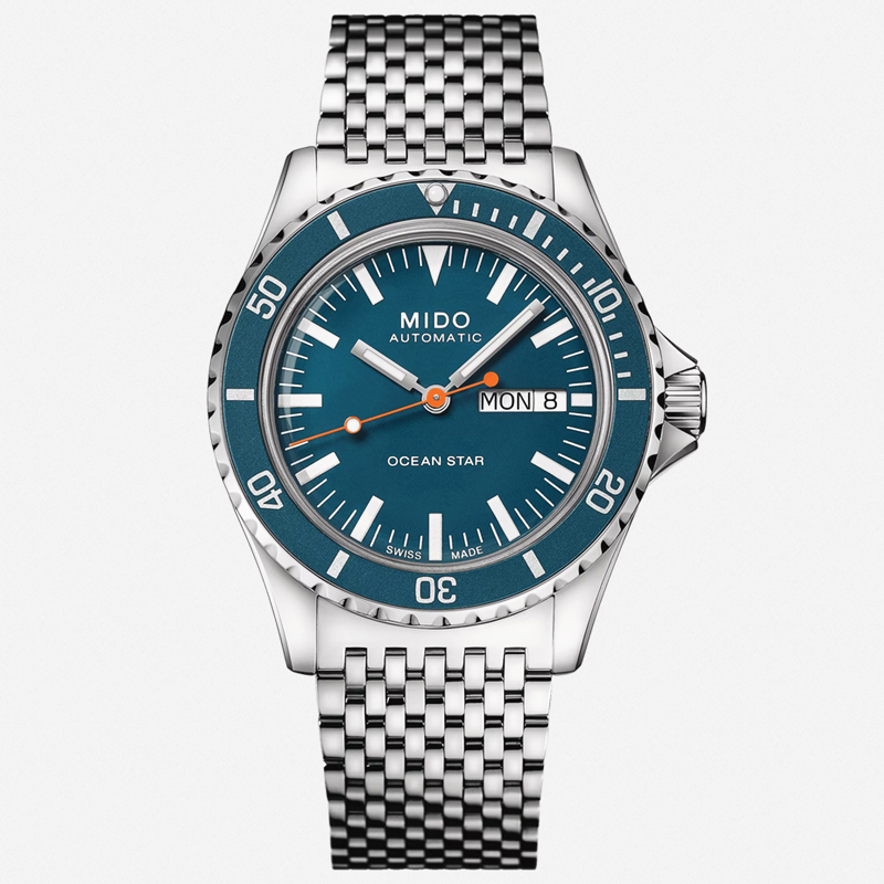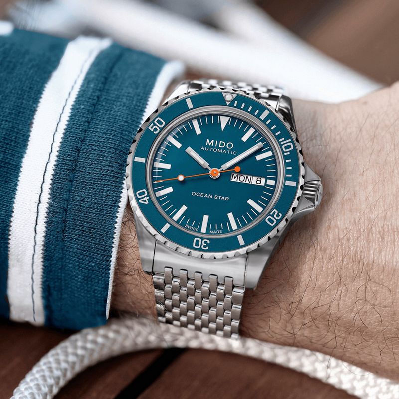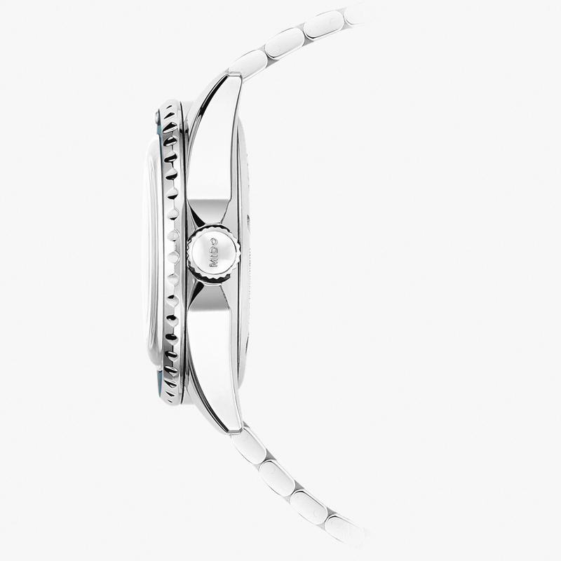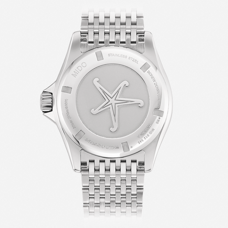 镜面 材质 | 蓝宝石水晶玻璃 | 表盘 | 丝光打磨不锈钢表壳,搭配陶瓷环丝光打磨单向旋转表圈 蓝色表盘立体镶嵌刻度日期 星期窗位于3点钟位置 密底,饰有抛光海星图案,镌刻序列号 |