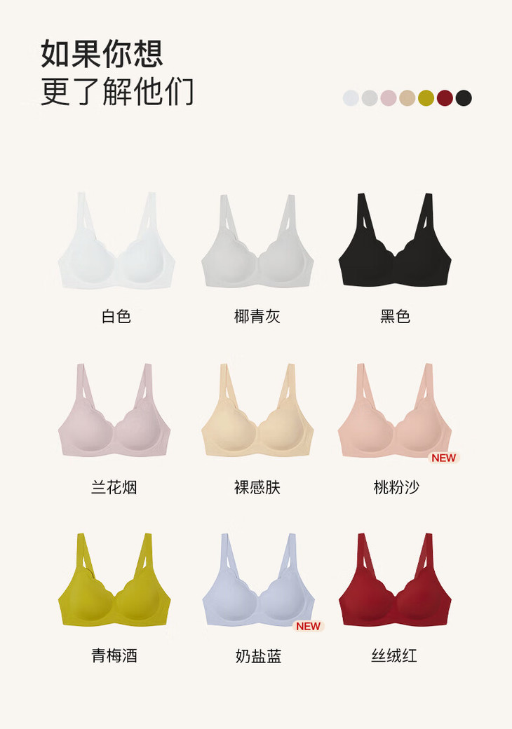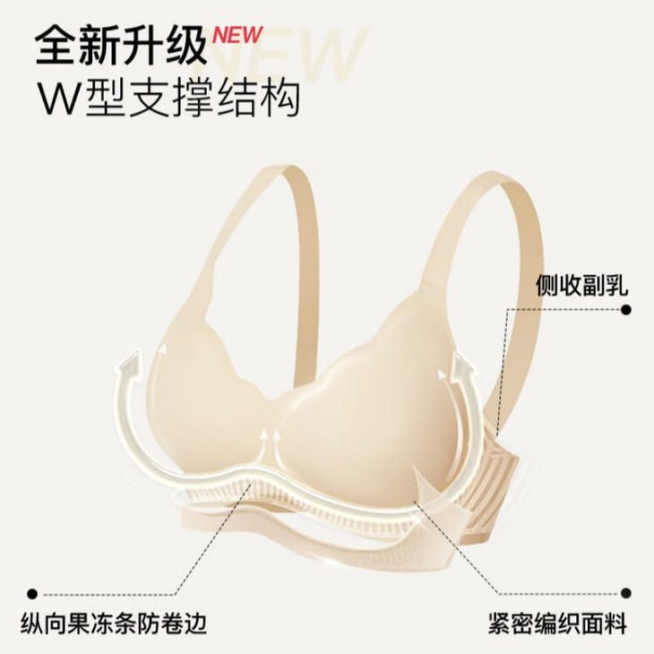 ✅第四代果冻条软支撑工艺升级: 底围内夹W型支撑条(三明治果冻胶条), 更好实现聚拢效果! 底围细密排布仅1.2mm纵向果冻条, 让底围稳定承托不卷边~ 侧后比采用几何形细密果冻条,平整收塑胸侧线条, 藏副乳、不外扩。