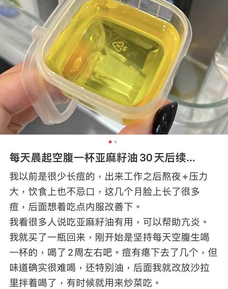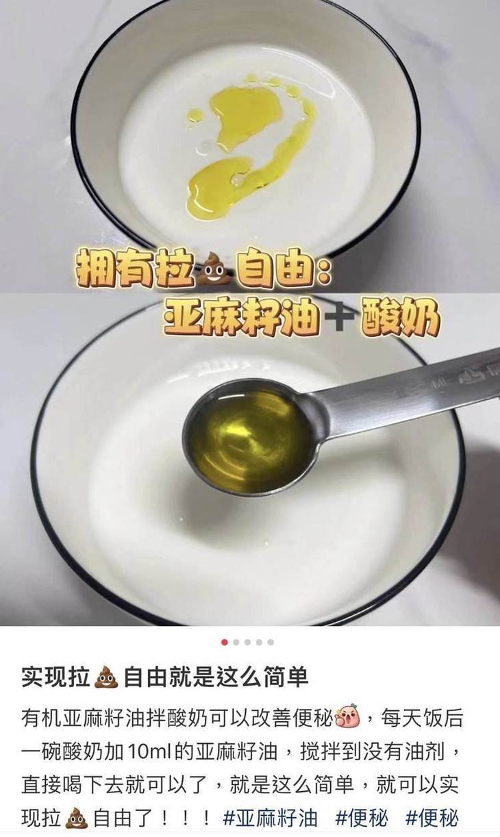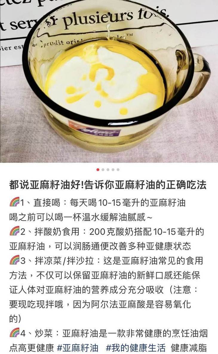 ③当蘸料 亚麻籽油还可以用来做调味汁、沙司 健康的同时还完全不用担心热量~ 例如:法棍面包蘸料、小吃蘸料等 ④做调料 单做调味汁是一番风味 与其他调味料(例如柠檬汁、酱油等) 组合做成酱料,更有特色 例如:各种沙拉的沙拉酱 ⑤直接喝 听起来虽然很“残暴” 但确实是一种好方式 建议早晨饭前或晚上睡前喝10ml左右 可以有效预防便秘哦