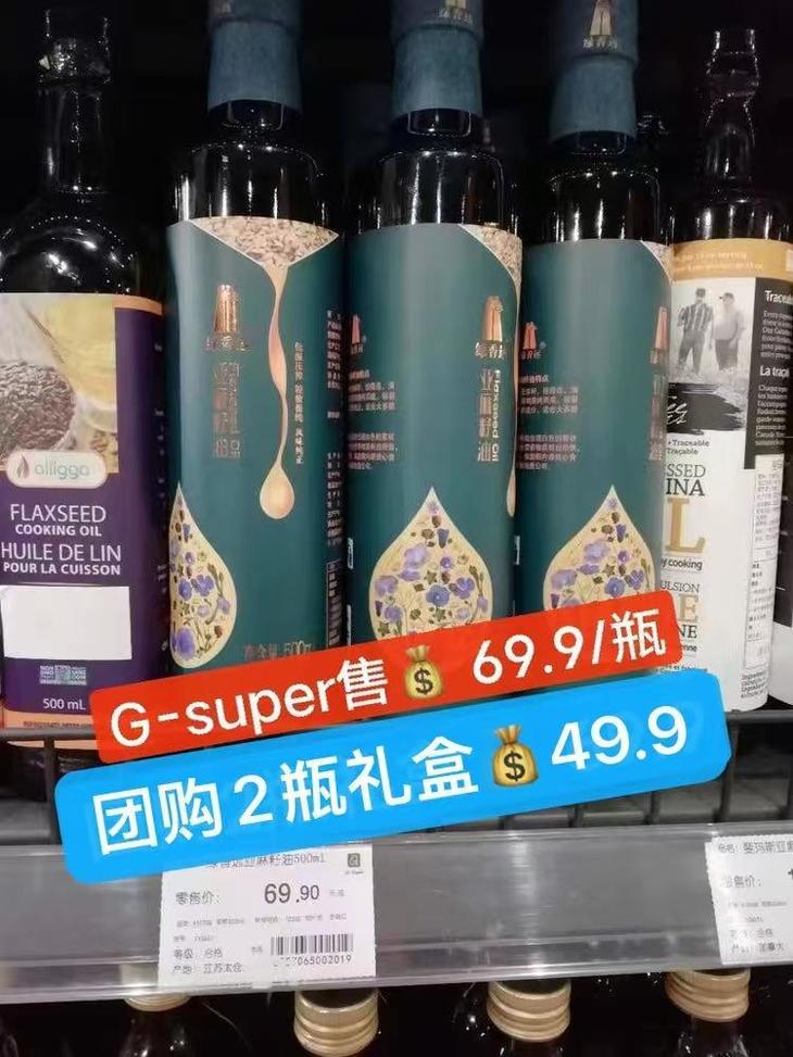 这亚麻籽油是比利时原油进口,顶级品质 一般超市都买不到 麦德隆、BHG、G-super在售的绿香远亚麻籽油 500ml精装版 G-super在售💰69.9一瓶,还是裸瓶 我们开团💰49.9到手2瓶,礼盒装 天然亚麻籽油,陆地上最补脑的厨房黄金油! 超级食物网红榜最具名气的健康食材 想要补充Omega-3 亚麻籽油就是最佳选择 欧盟总部质量验证,安全大可放心 健康好油,少吃油,吃好油