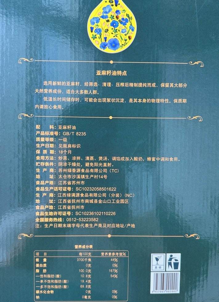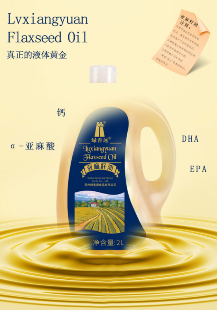 绿香远亚麻籽油选用新鲜亚麻籽 经筛选、清理、低温压榨后精制提纯 并立即充氮气保鲜封装而成 不添加任何化学物质,如抗氧化剂等 力求每一滴都保全其全部天然营养成分