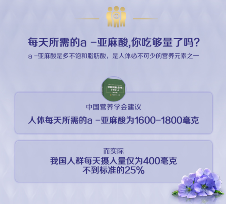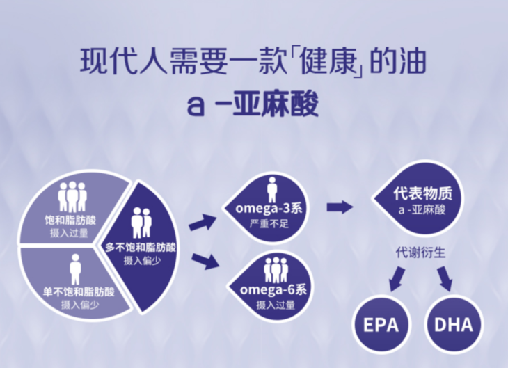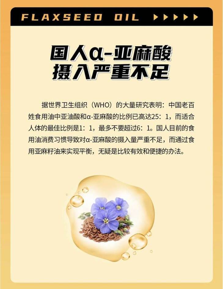 据世界卫生组织(WHO)的大量研究表明 我们的食用油中亚油酸和 α-亚麻酸的比例已高达25:1 而适合人体的最佳比例是1:1,最多不要超过6:1 国人目前的食用油消费习惯导致 对α-亚麻酸的摄入量严重不足 而通过食用亚麻籽油来实现平衡 无疑是比较有效和便捷的办法🍻