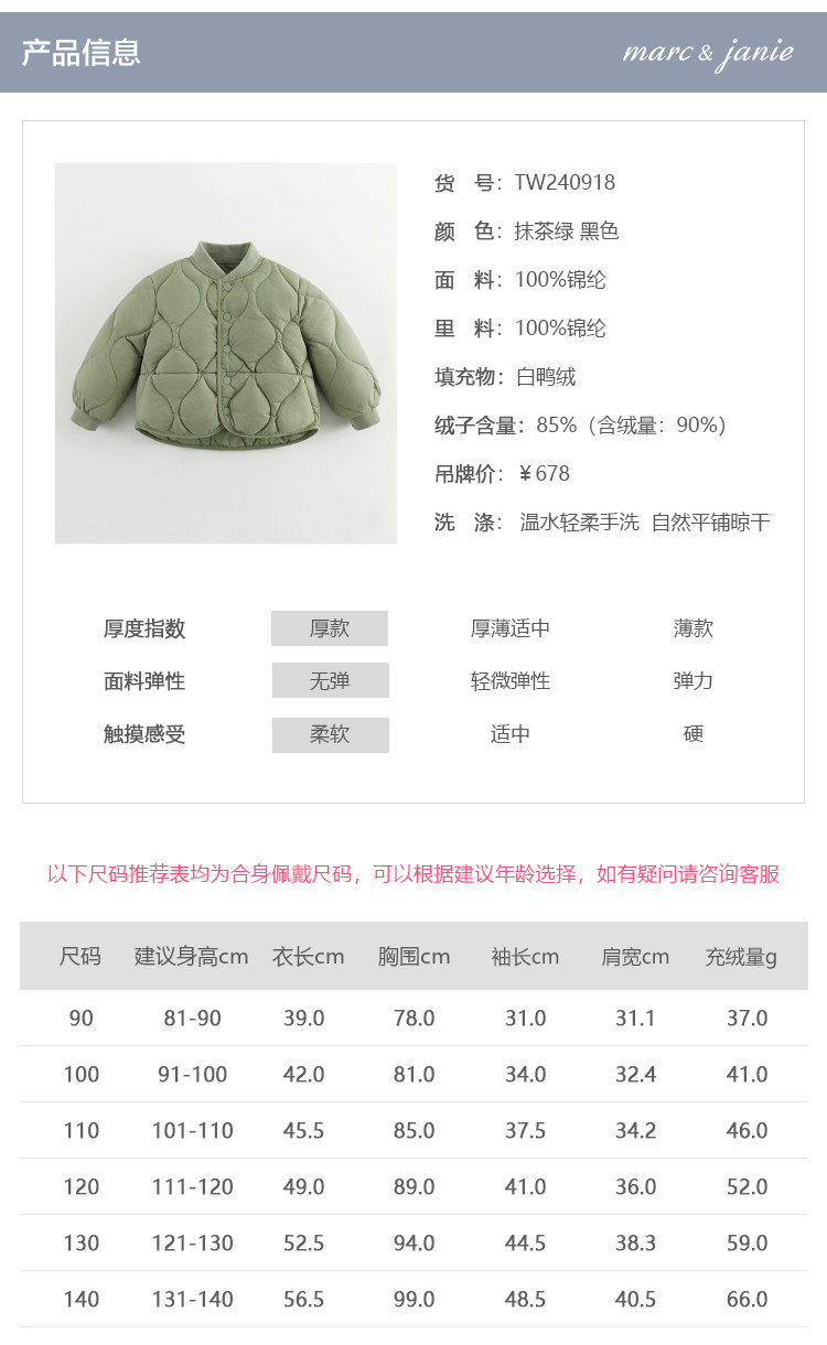 【三防户外】马克珍妮男女童棒球领超轻保暖羽绒服冬装新款240918
