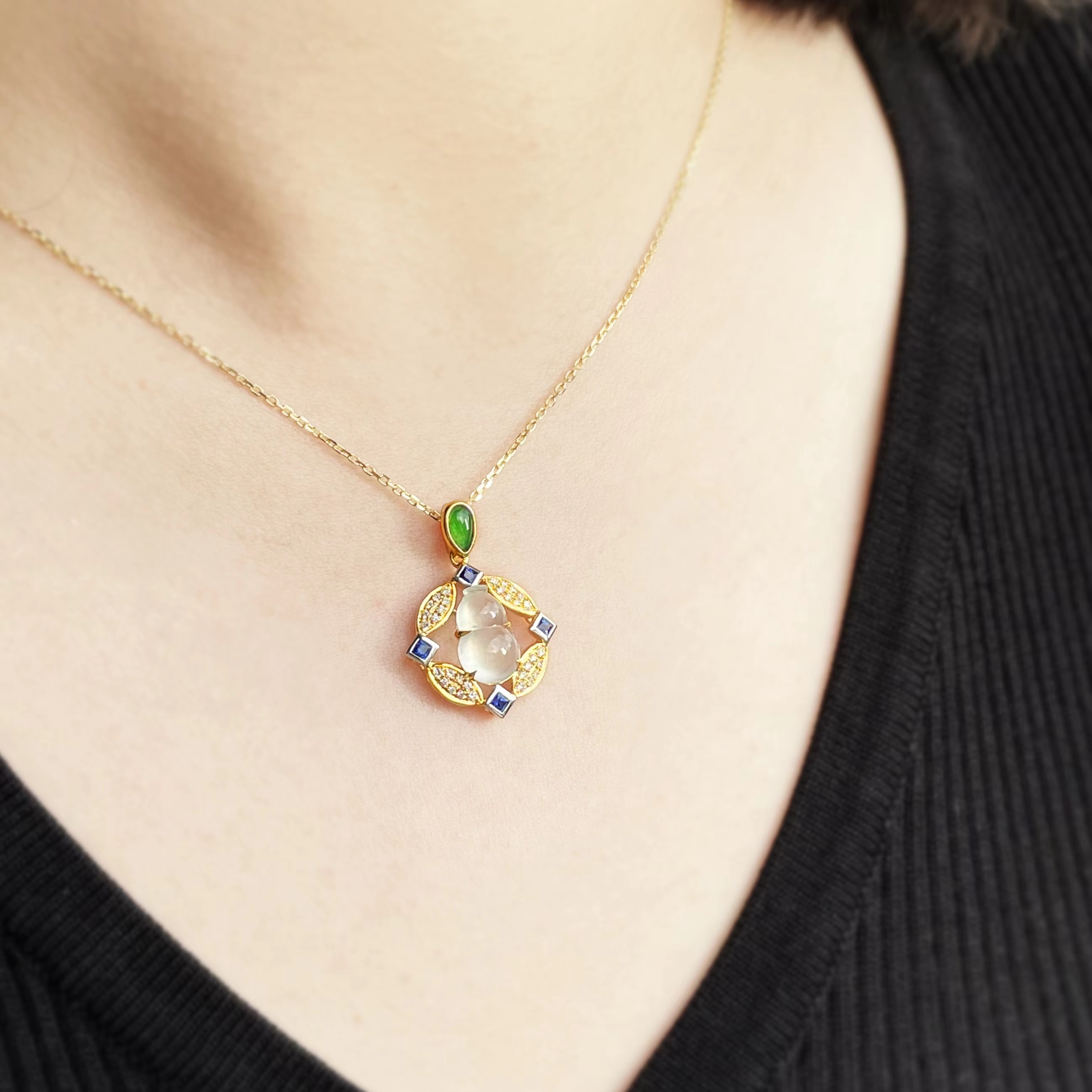 吊坠上方一颗绿翡翠,由18K金连接至方形蓝宝石,