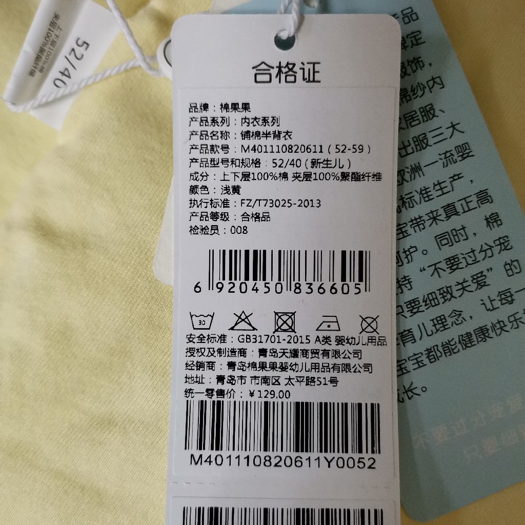 棉果果冬季内衣男童女童上衣铺棉半背衣家居上装家居上装M401110820611
