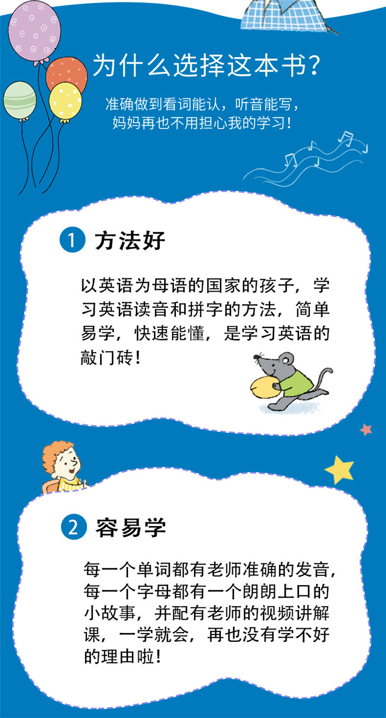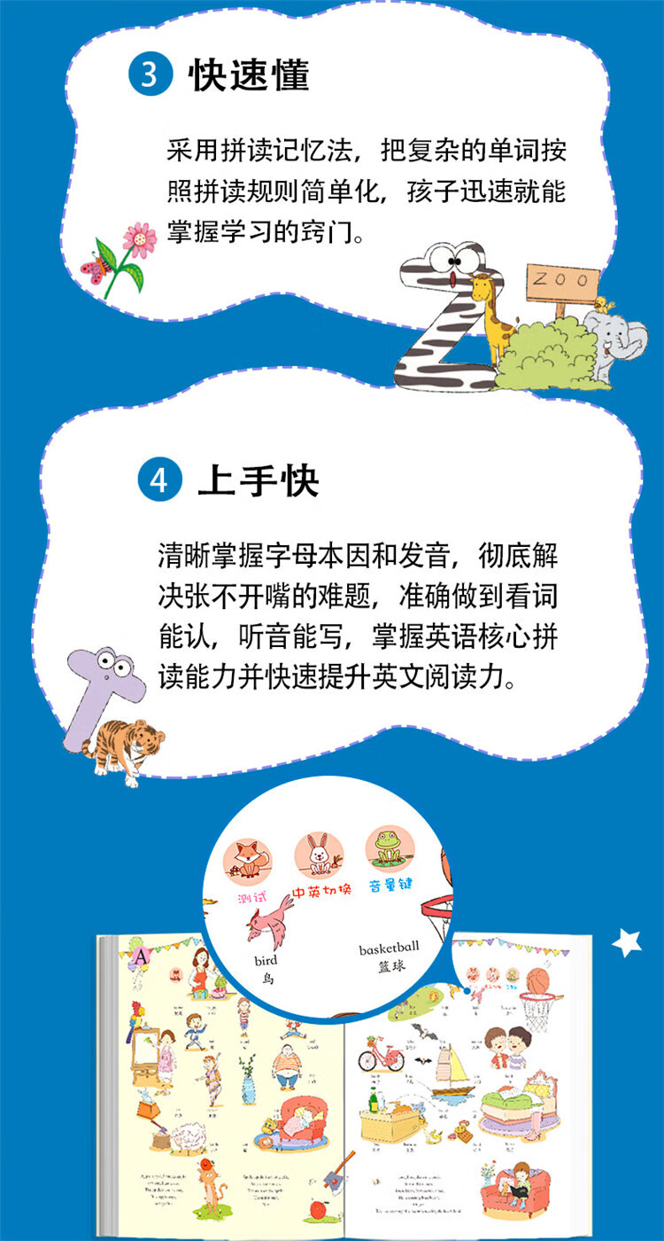清晰掌握字母本因和发音,彻底解决张不开嘴的难题,准确做到看词能认,听音能写,掌握英语核心拼读能力并快速提升英文阅读力。