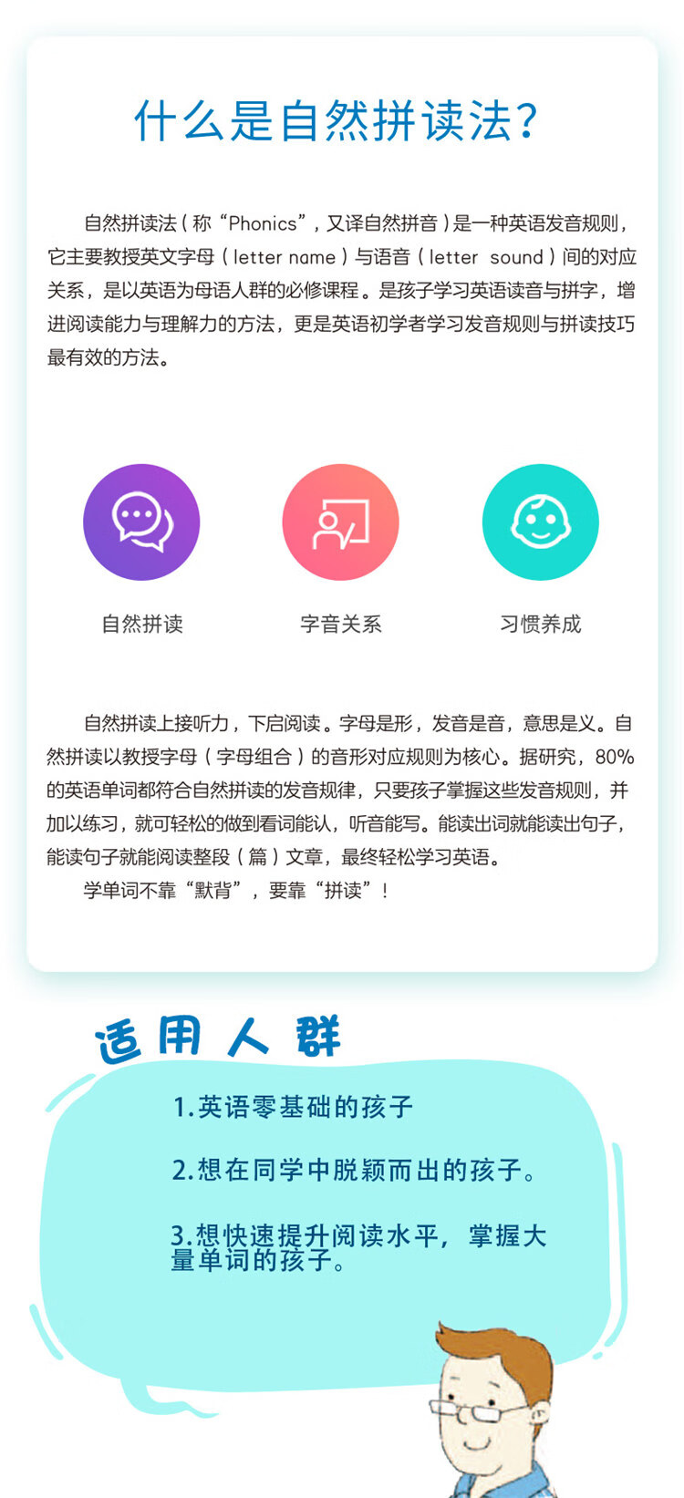 3-12岁英语零基础的孩子。 想在同学中脱颖而出的孩子。 想快速提升阅读水平,掌握大量单词的孩子
