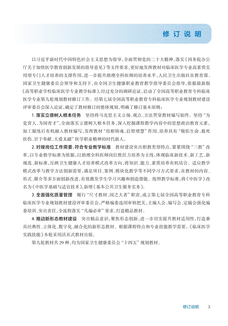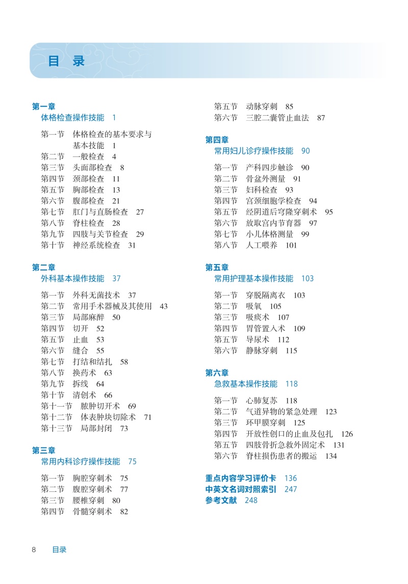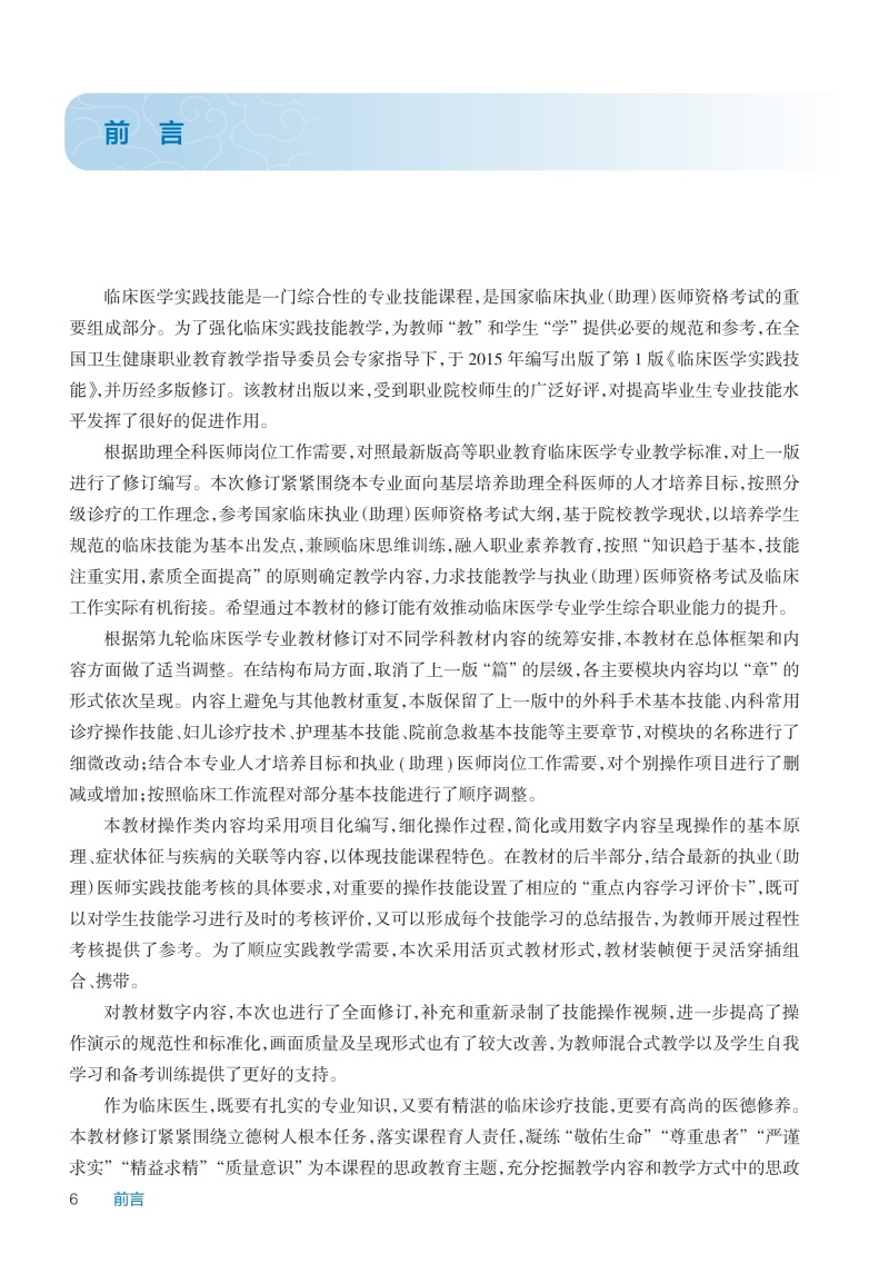 国家卫生健康委员会“十四五”高等职业教育专科临床医学专业规划教材之一。本教材围绕岗位胜任力培养,参照临床执业助理医师资格考试大纲要求,遵循“知识趋于基本,技能注重实用,素质全面提高”的原则科学设置课程内容,适应“早临床、多临床、反复临床”人才培养模式的需要,按照医学教育规律和人才成长规律开展教学。既突出临床应用,又紧贴“执考”这个重点,恰当处理与其他课程间的内在联系,加强课程内容的渗透和融合,充分发挥课程间的相互支撑作用。教材涵盖体格检查技能、外科手术基本技能、内科常用诊疗操作技能、妇儿诊疗技术、急救基本技能、护理基本技能、临床执业(助理)医师资格考试实践技能考核以及“客观结构化临床技能考核(OSCE)”的基本考核内容、考核形式与要求。以立德树人为根本,将正确的世界观、人生观、价值观和“敬佑生命,救死扶伤,甘于奉献,大爱无疆”的职业精神有机融入到教材内容中。