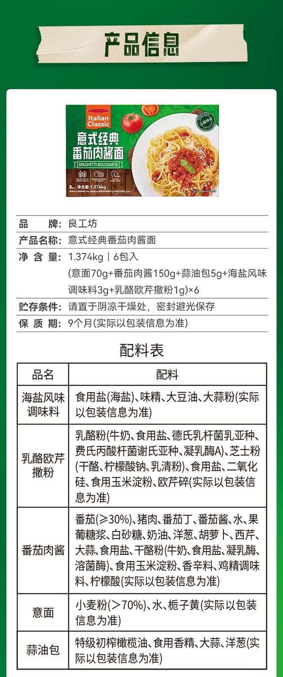 【自提】M良工坊 意式经典番茄肉酱面1.374kg(6包入)