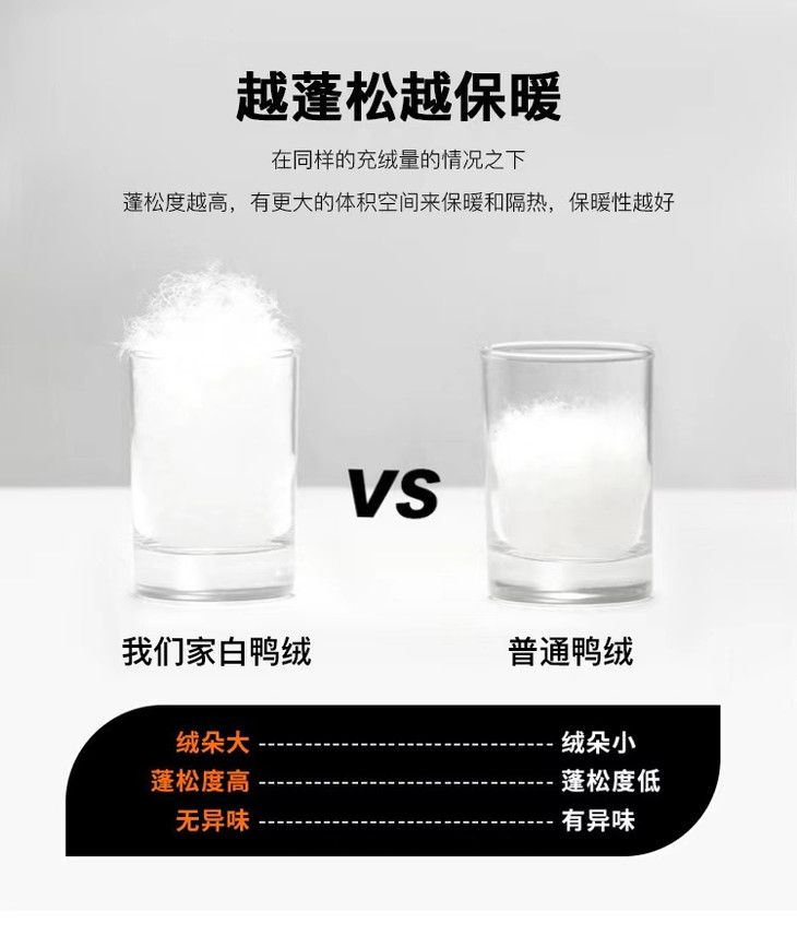 ✅含绒量高达90%,轻盈而温暖! 保暖 | 透气 | 轻盈 | 洁净 | 朵绒大 精选长在鸭腹部上的羽绒 它呈芦花朵状 属于动物性蛋白质纤维 密布着千万个三角形的细小气孔 能随气温变化而收缩膨胀 产生调温功能❗ 还可以吸收人体散发流动的热气 隔绝外界冷空气的入侵 带来意想不到的温暖❗ 既有羽绒服的温暖, 同时又不会显得过于臃肿! 可以在里面搭配任意厚度的衣服