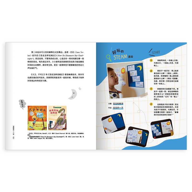 作家根据亲子共读实践,精选近90本全球著名经典绘本,设计出43个适合共读互动的STEAM实验活动,旨在通过绘本阅读和亲子游戏,轻松培养孩子的STEAM素养。全书内容根据0—3岁、4—5岁、6—7岁、8—9岁四个年龄段进行分层,巧妙融合科学、技术、工程、艺术、数学五大学科教育,让STEAM教育自然融入孩子的日常生活。本书倡导STEAM教育是一种生活教育,而非必须依赖炫目的STEAM教玩具才能达到教育目标。