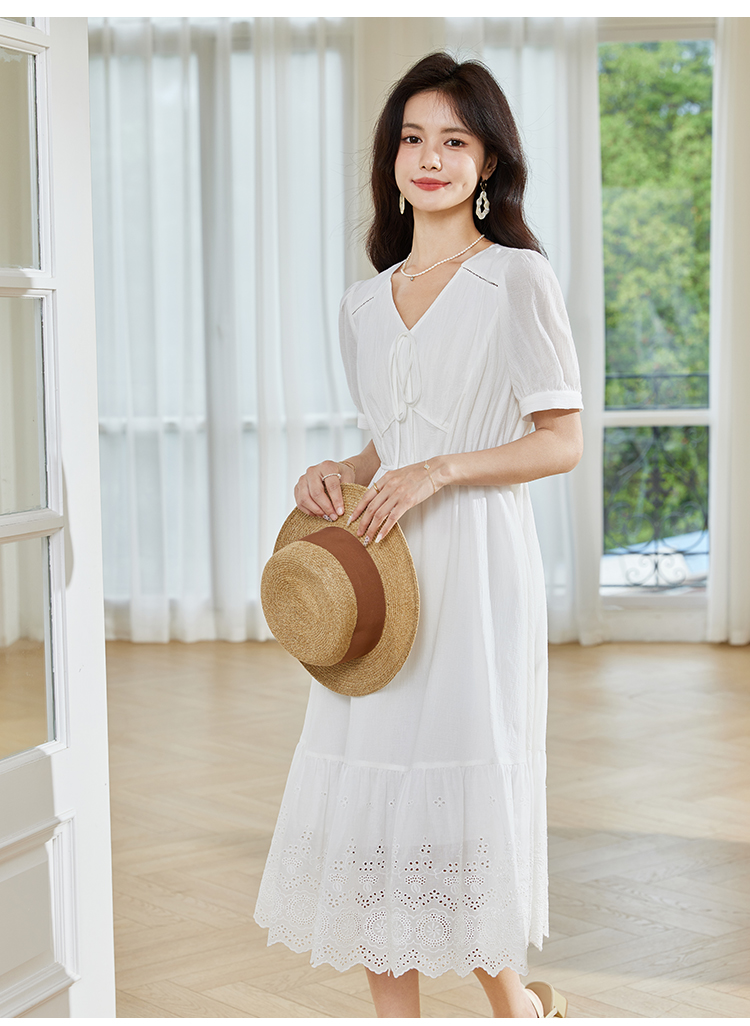 【专属特价】熙世界100.纯棉白色V领连衣裙2024夏天新款度假风A字裙仙女裙子