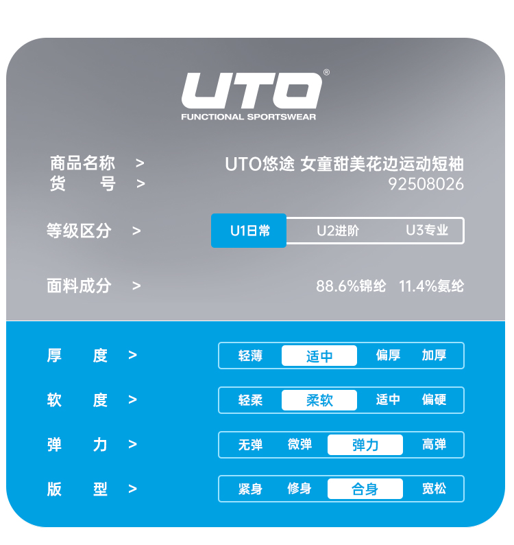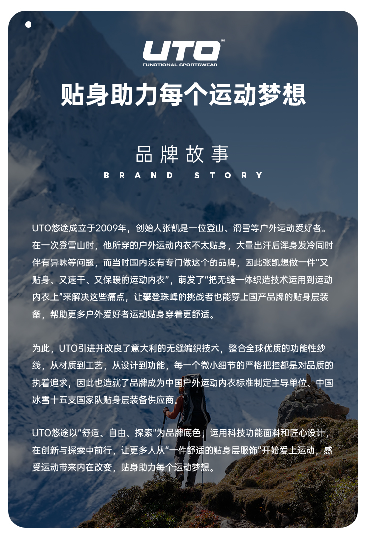 UTO悠途潜心于贴身运动装备的研发、设计和生产。从纤维到组织,从设计到工艺,在无缝贴身运动装备领域,树立国内标杆。 UTO着力于品牌互联网化,不断采集大量运动数据,为跑步、健身、滑雪等不同类型的运动爱