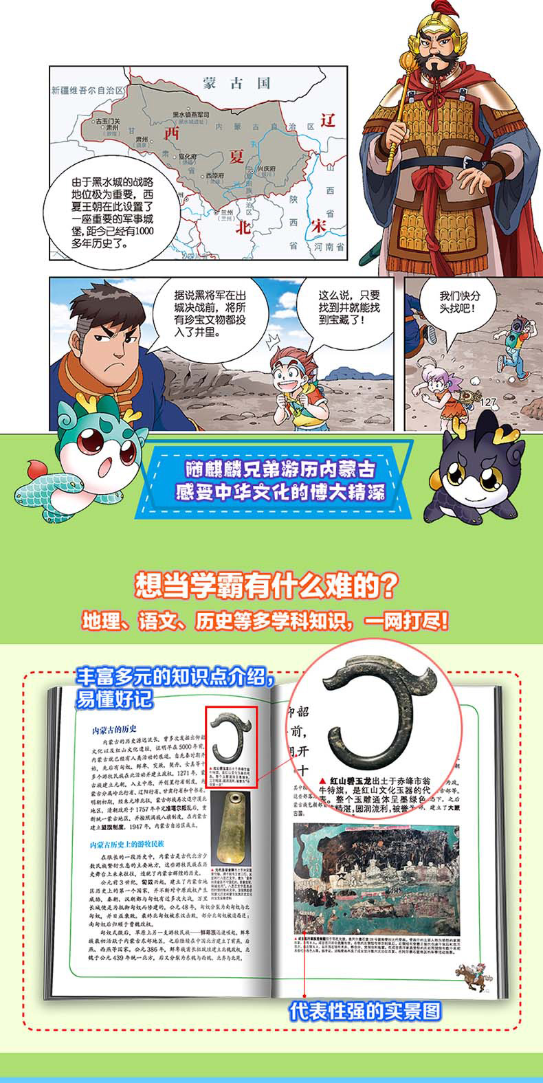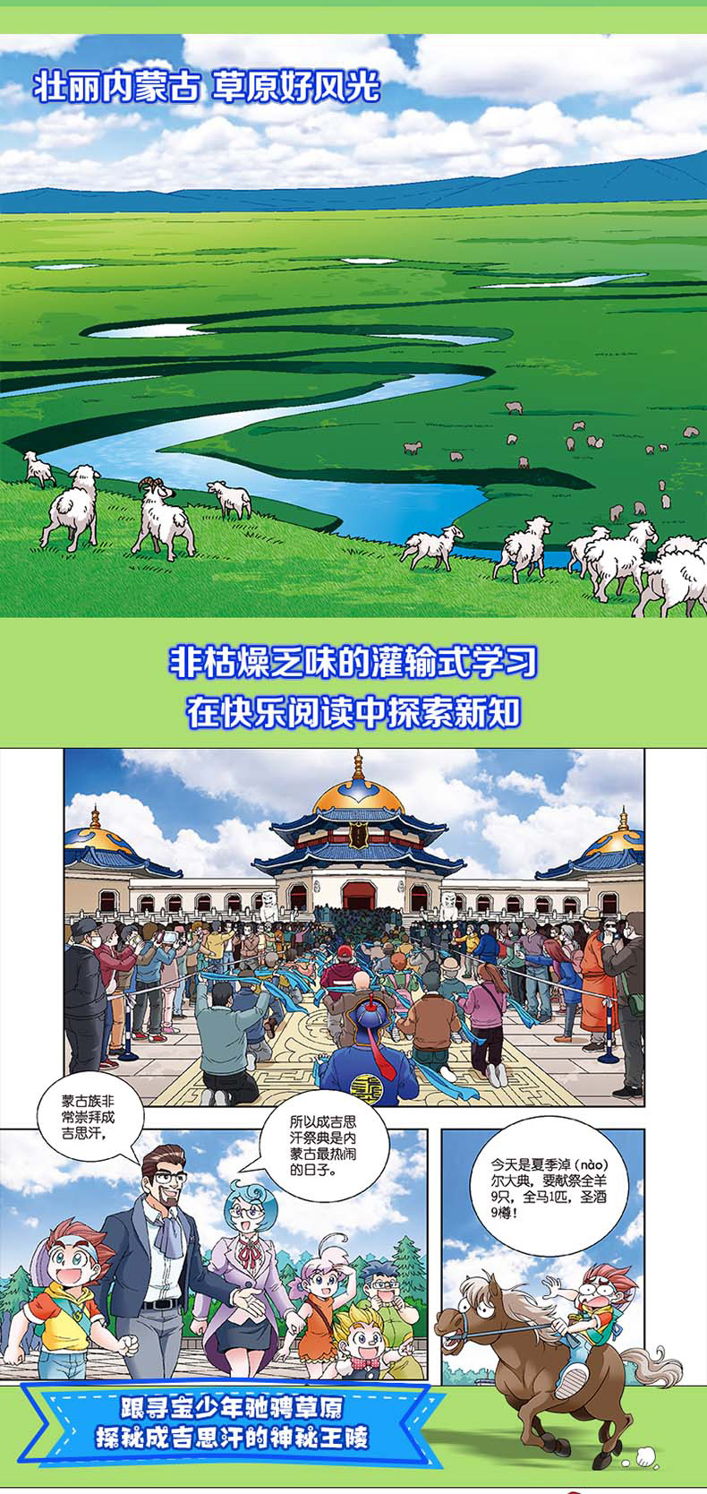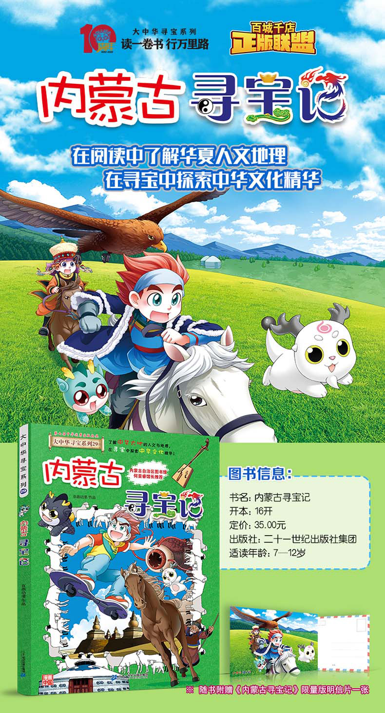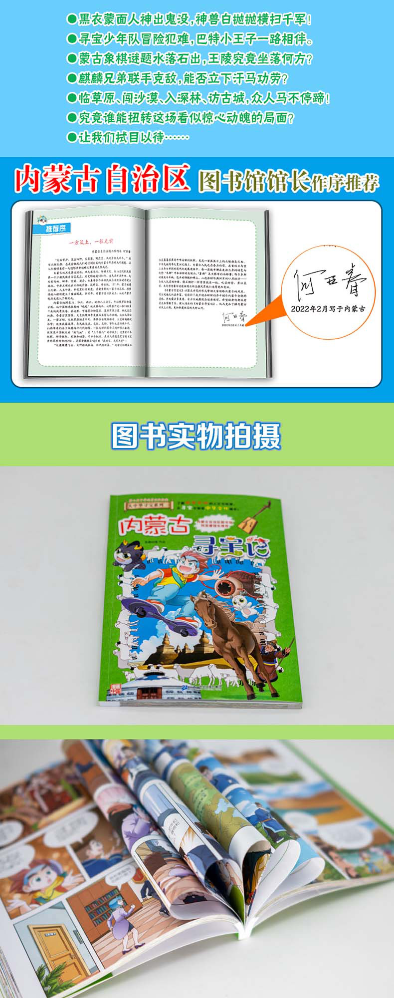 《大中华寻宝系列29内蒙古寻宝记》是一部融合了地理与文史知识,集趣味性、可读性于一体的原创知识漫画作品。它以惊险逗趣的寻宝故事为载体,带领读者了解内蒙古自治区的历史遗迹、地理人文等知识。“大中华寻宝系列”让孩子们认识、了解、热爱这片生活着的中华大地,激发他们的爱国热情,是中华文化别开生面的呈现。