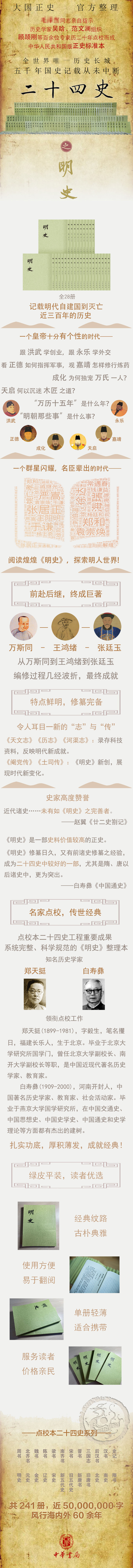《明史》332卷,记载了明朝自建国到灭亡将近三百年的历史。《明史(二十四史繁体竖排 套装1-28册)》的整理,以乾隆四年(1739)武英殿原刊本进行标点分段,以《明实录》、《明史稿》、《明会典》等近十种明代史籍进行校勘。