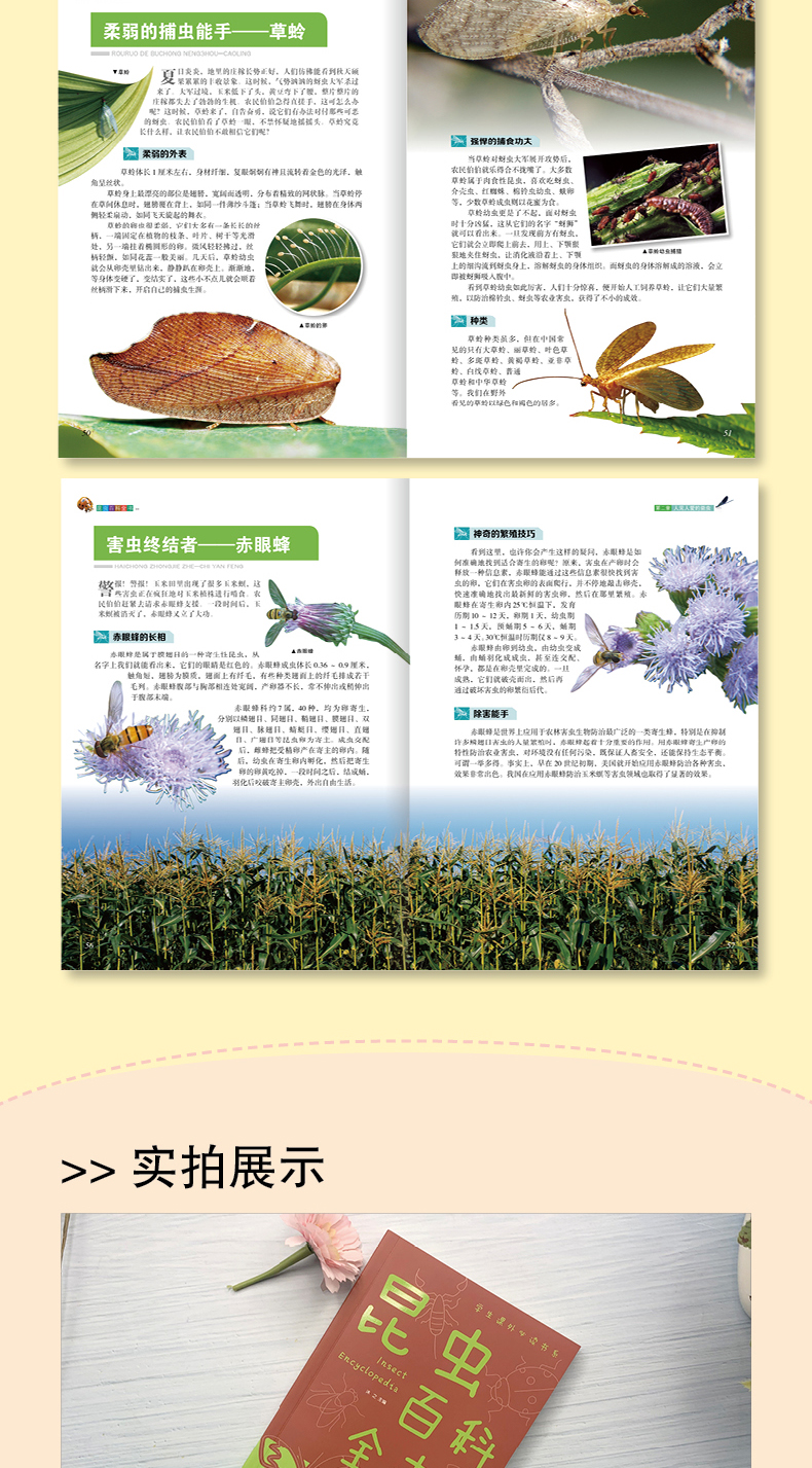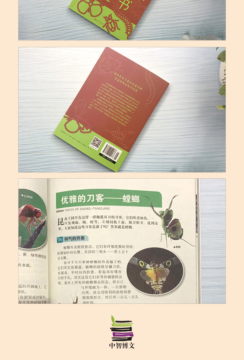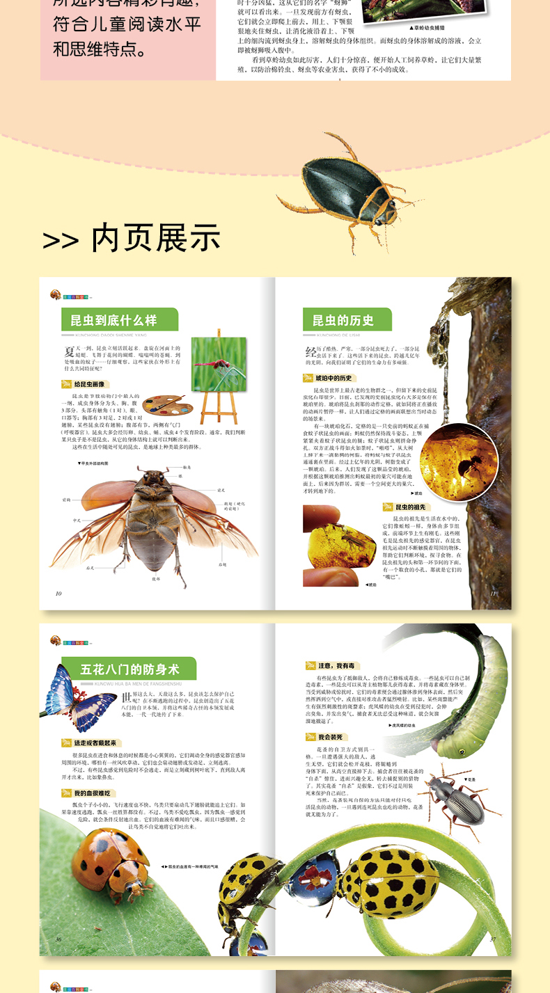 你知道昆虫是怎么呼吸的吗?你知道蟋蟀是怎么发出叫声的吗?苍蝇、蚊子为什么能够飞得那么快?萤火虫为什么会发光呢?肉乎乎的毛毛虫怎么就变成五彩缤纷的蝴蝶了呢?你观察过蚂蚁搬运食物的情景吗?蜻蜓是如何飞起来的?花蚤"自杀"是假的?切叶蚁竟然会种蘑菇!让我们一起到绚烂多姿的昆虫世界里解开这些秘密吧。本书精心挑选了多种昆虫,从整体到局部,从群体到个体介绍昆虫生长历程、身体结构以及它们奇奇怪怪的行为,多层次、全方位地展现庞杂而生动的昆虫世界。我们相信,这本书的出版一定能够让小朋友更加了解并喜欢上昆虫。