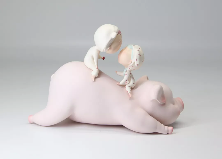 《送你一颗糖果》的作品,灵感点来源于今年猪年我本身要办我人生中的喜事,男女人物以睡衣形象骑坐在充满天真烂漫笑意盈盈的小猪背上,男孩手里捧着一颗糖果,女孩上扬的嘴角和他们将将亲吻到的羞涩神情与温柔,充斥着浪漫美妙的气息,想与大家分享这一时刻,也愿大家都可以像糖果一样甜蜜。