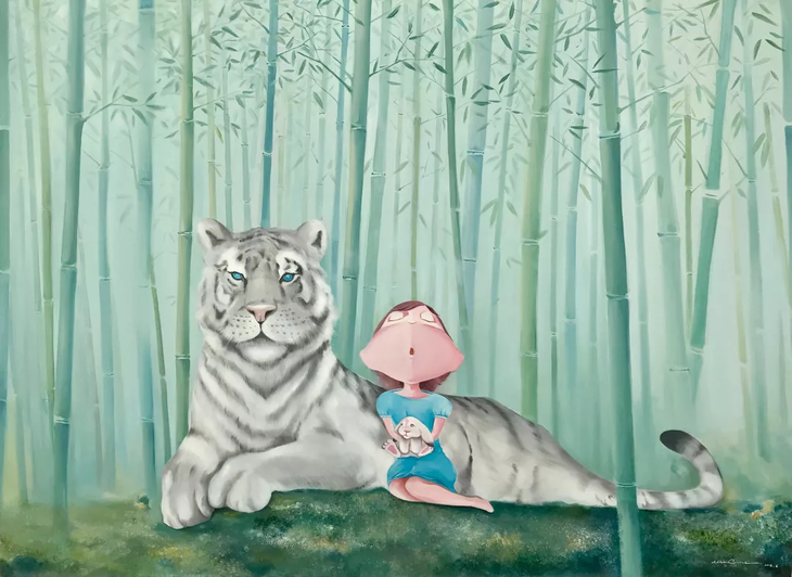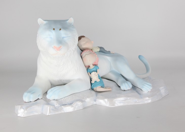 《守护》来源于18年的一张油画《竹林中的小脑斧》雕塑形象与老虎神似但金色的吊睛,蓝色的身纹有种神护意味,女孩抱着自己的宠物安逸的睡在它怀里,男孩俏皮的给女孩一个“摸头杀”,在童话般的世界里有着化身的守护神,二人肆无忌惮的梦幻人生。