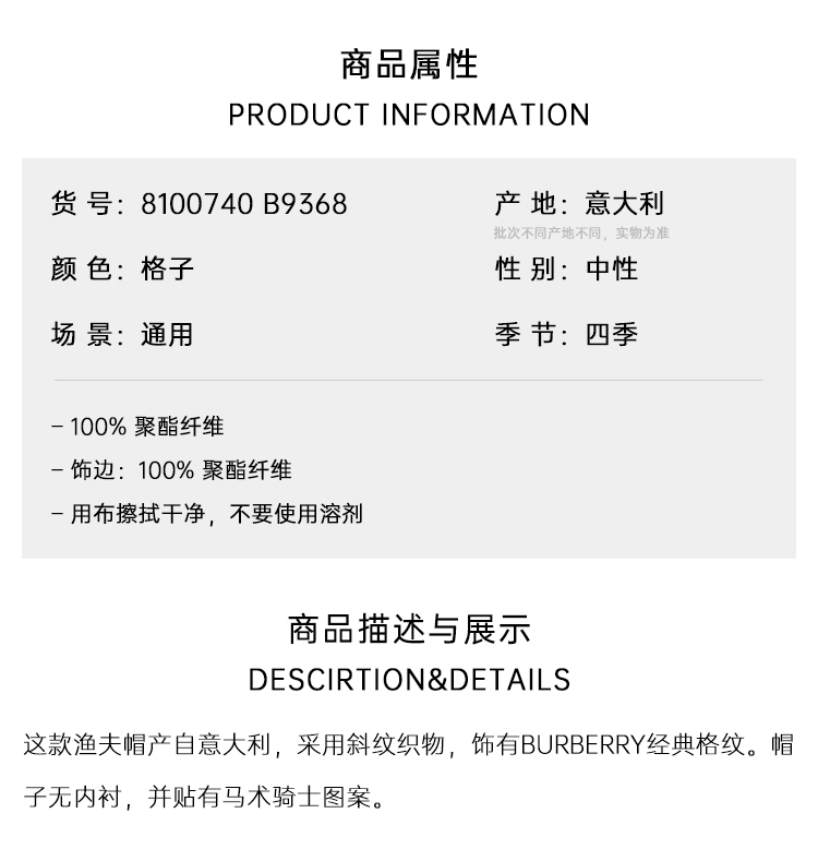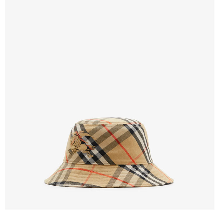 BURBERRY 巴宝莉 男女同款马术骑士徽标刺绣格纹渔夫帽 格子 8100740 B9368
