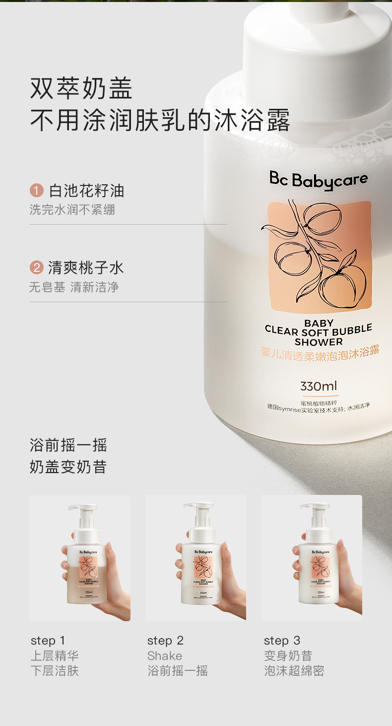 babycare宝宝洗发沐浴二合一330ml/瓶 婴幼儿童桃叶清透柔嫩泡泡沐浴露