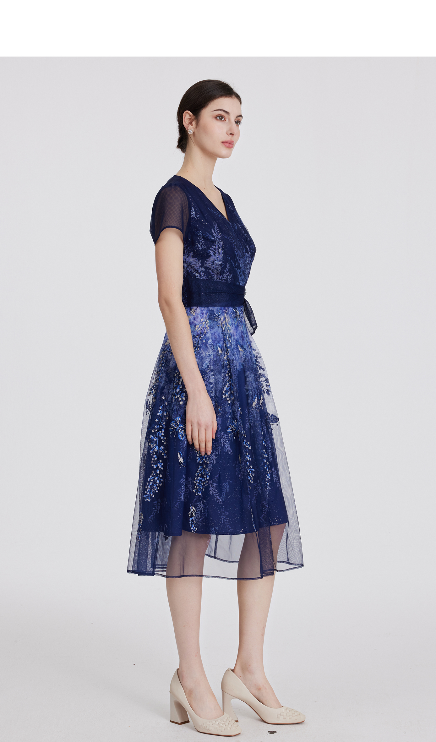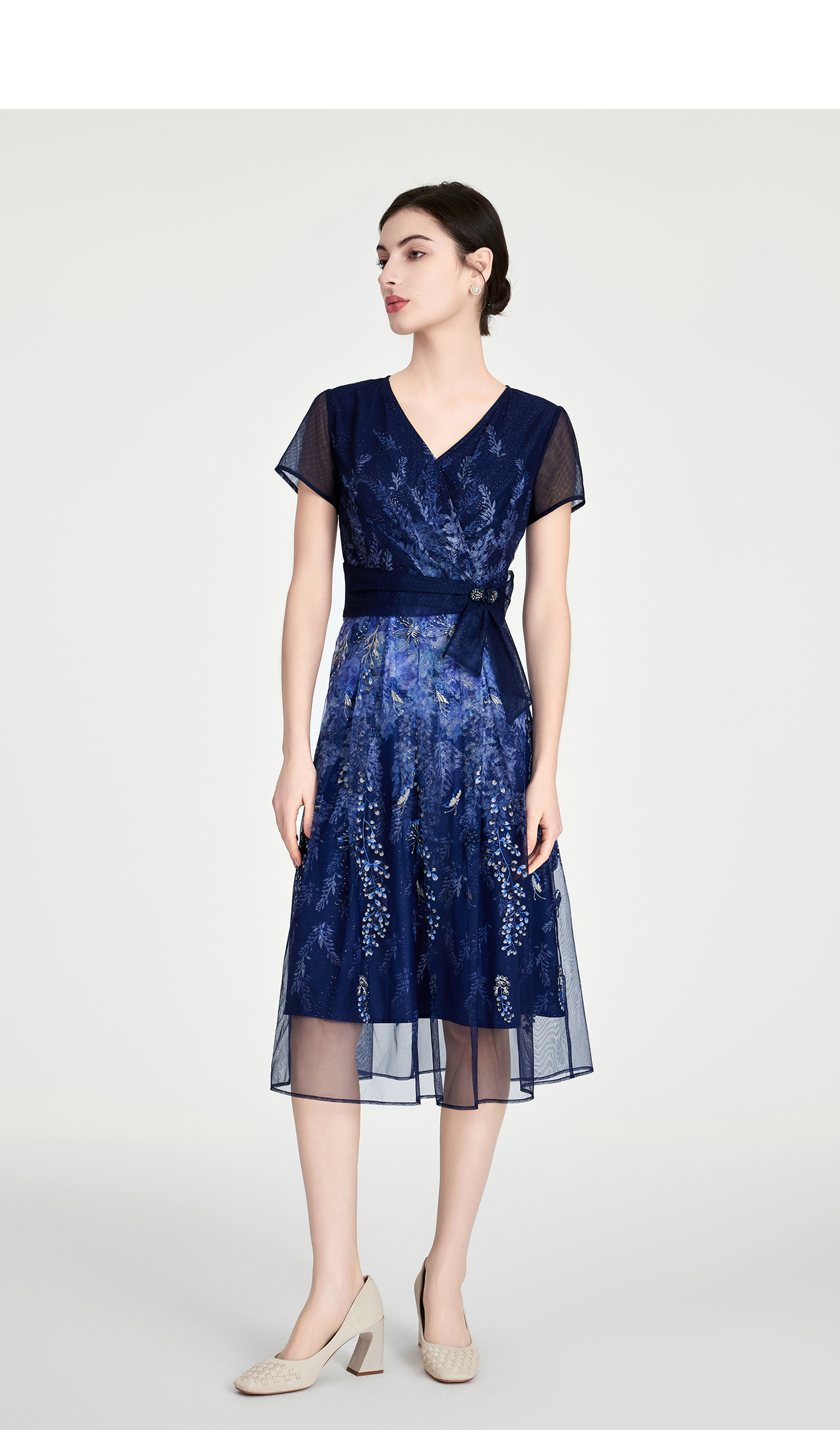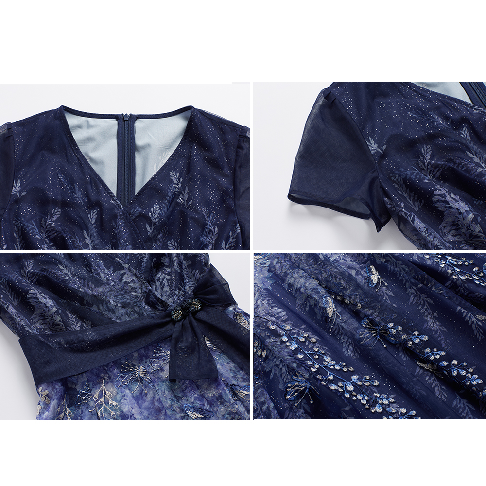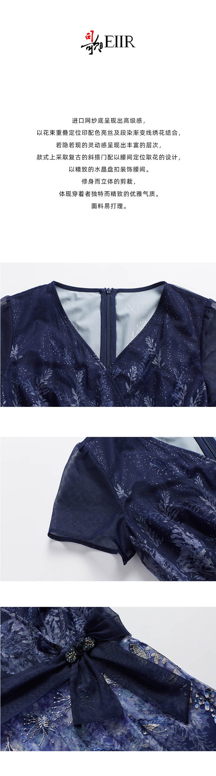 司歌v领刺绣短袖印花连衣裙国风优雅A891090X