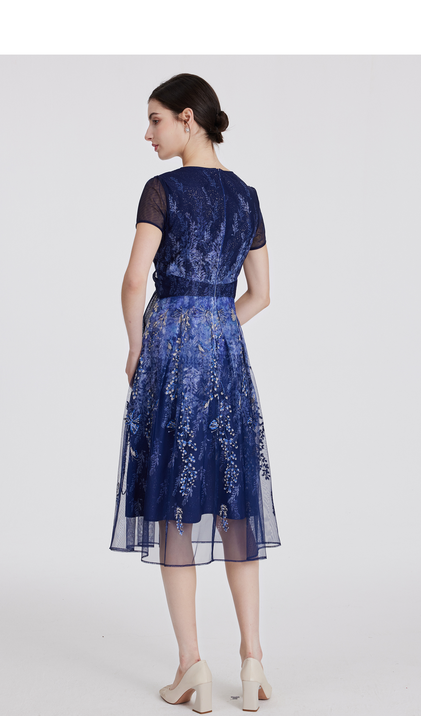司歌网纱印花长袖连衣裙圆领复古端庄A881316