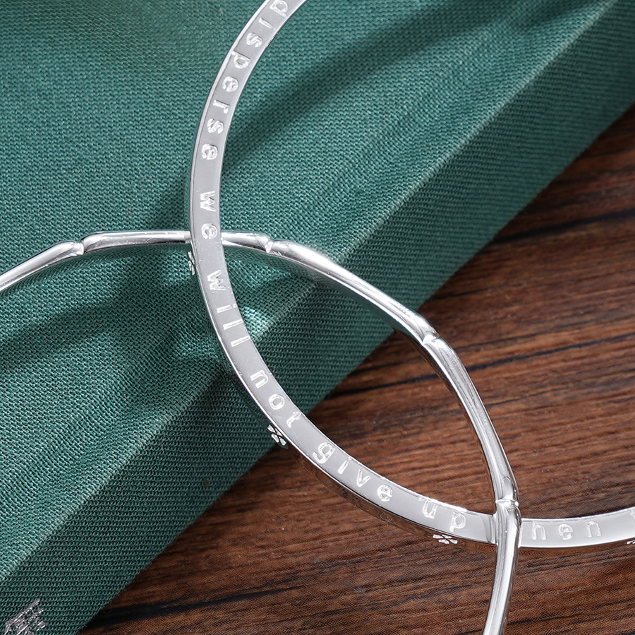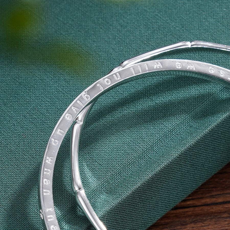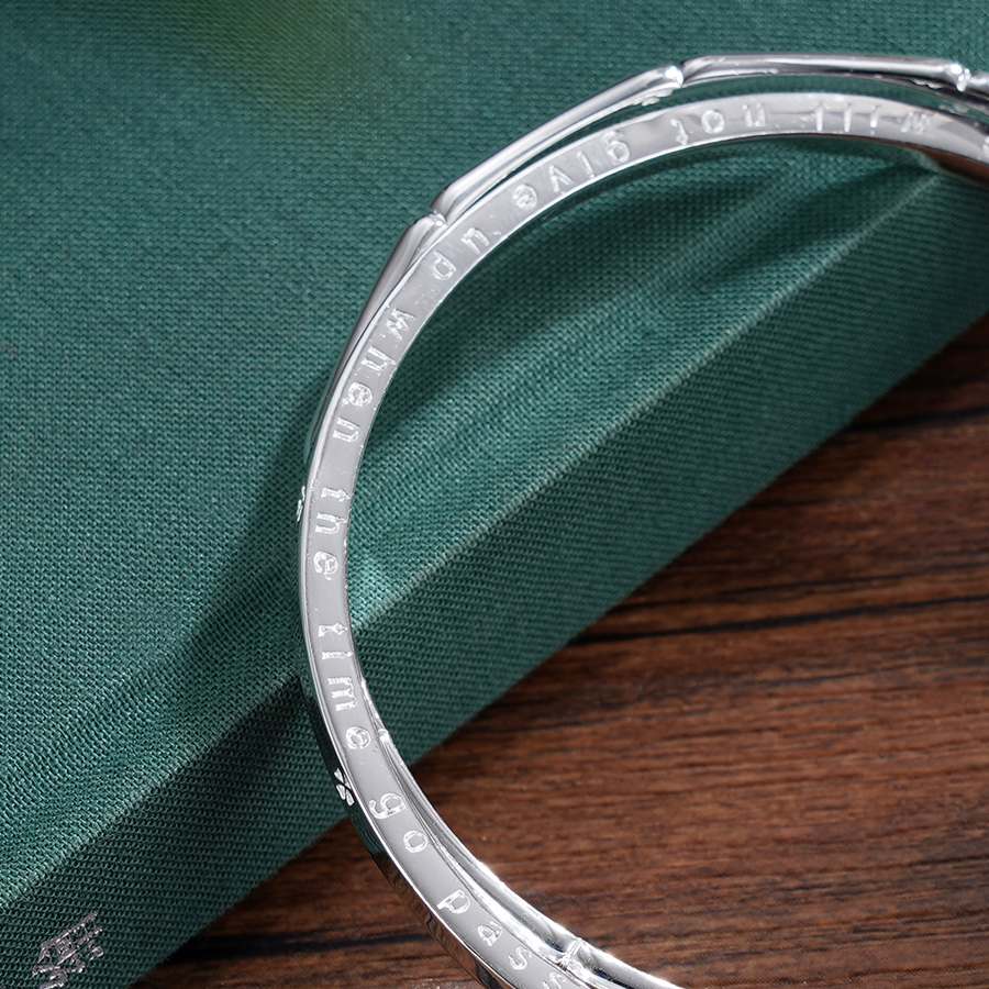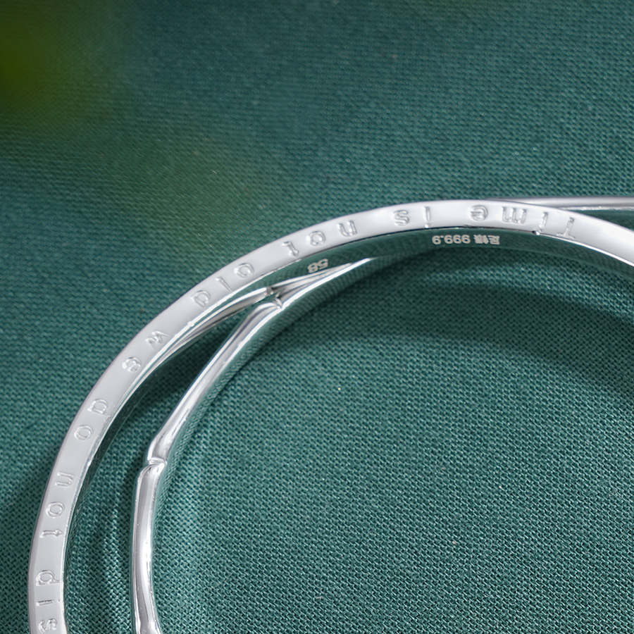 【寓意】:纯银手镯赠礼佳品,表面錾刻英文“时光不老,我们不散”,腕间留下唯美光晕,为“礼赠”传递温情宣言。