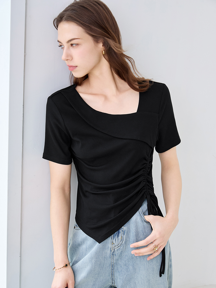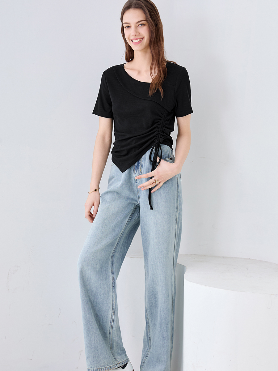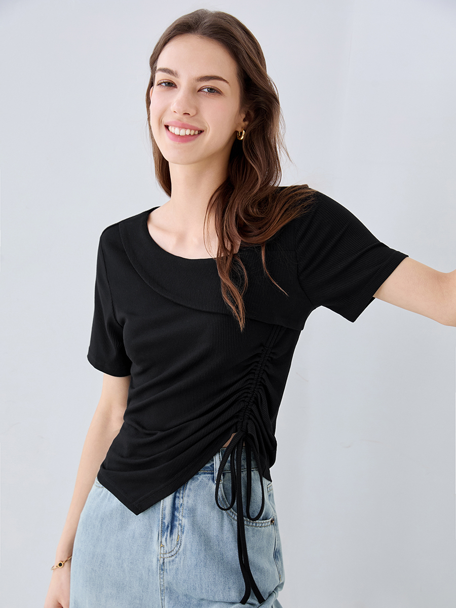 【百图lulu定制】【褶皱T恤】betu百图设计感抽绳收腰显瘦T恤女短袖2025年夏季新款褶皱小衫