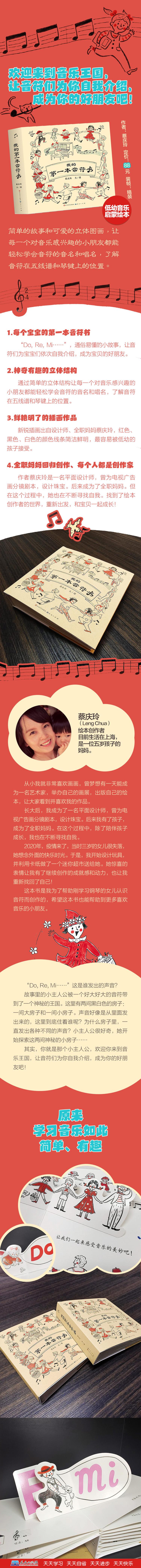 这是一本为小宝贝量身定制的低幼音乐启蒙绘本,通过简单的故事和可爱的立体图画,让每一个对钢琴感兴趣的小朋友都能轻松学会音符的音名和唱名,了解音符在五线谱和琴键上的位置。原来,学习音乐如此简单、有趣!“Do, Re, Mi……”这是谁发出的声音?故事里的小主人公被一个好大好大的音符带到了一个神秘的王国。这里有两间黑白色的房子:一间大房子和一间小房子。声音好像是从里面发出来的,这里到底住着谁呢?为什么房子里,一直发出各种不同的声音?小主人公很好奇,她开始探索这两间神秘的小房子……其实,你就是那个小主人公,欢迎你来到音乐王国,让音符们为你自我介绍,成为你的好朋友吧!