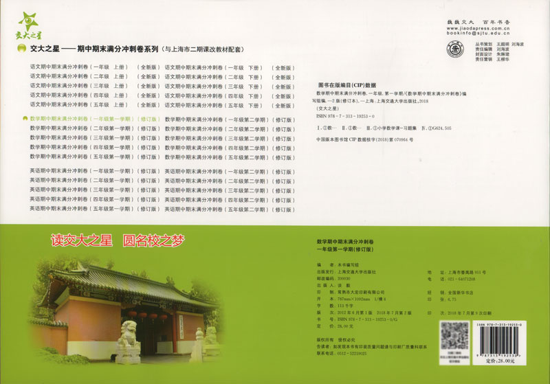 正版现货 交大之星 期中期数学期中期末满分冲刺卷 一年级上/第一学期