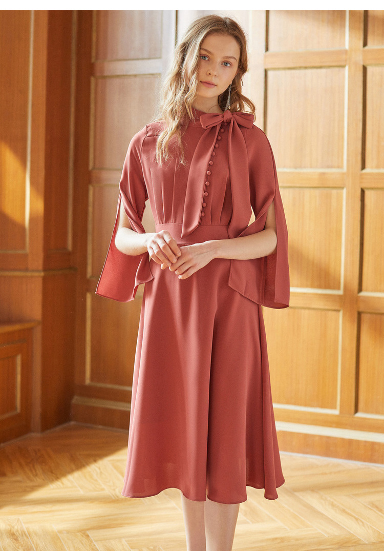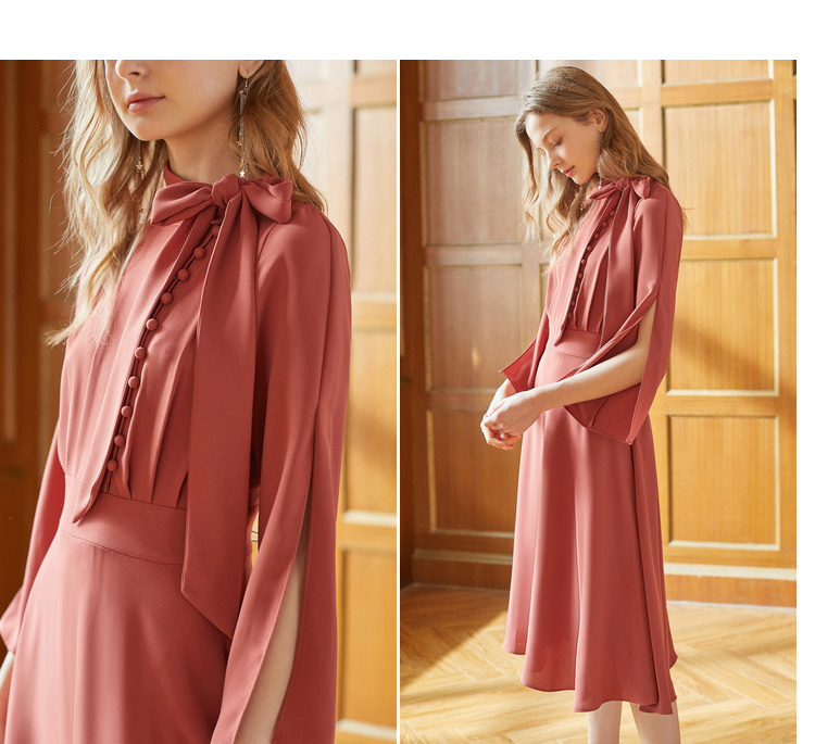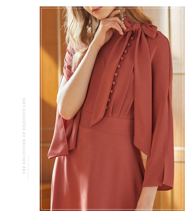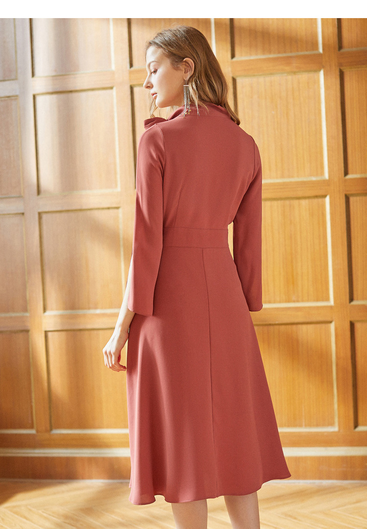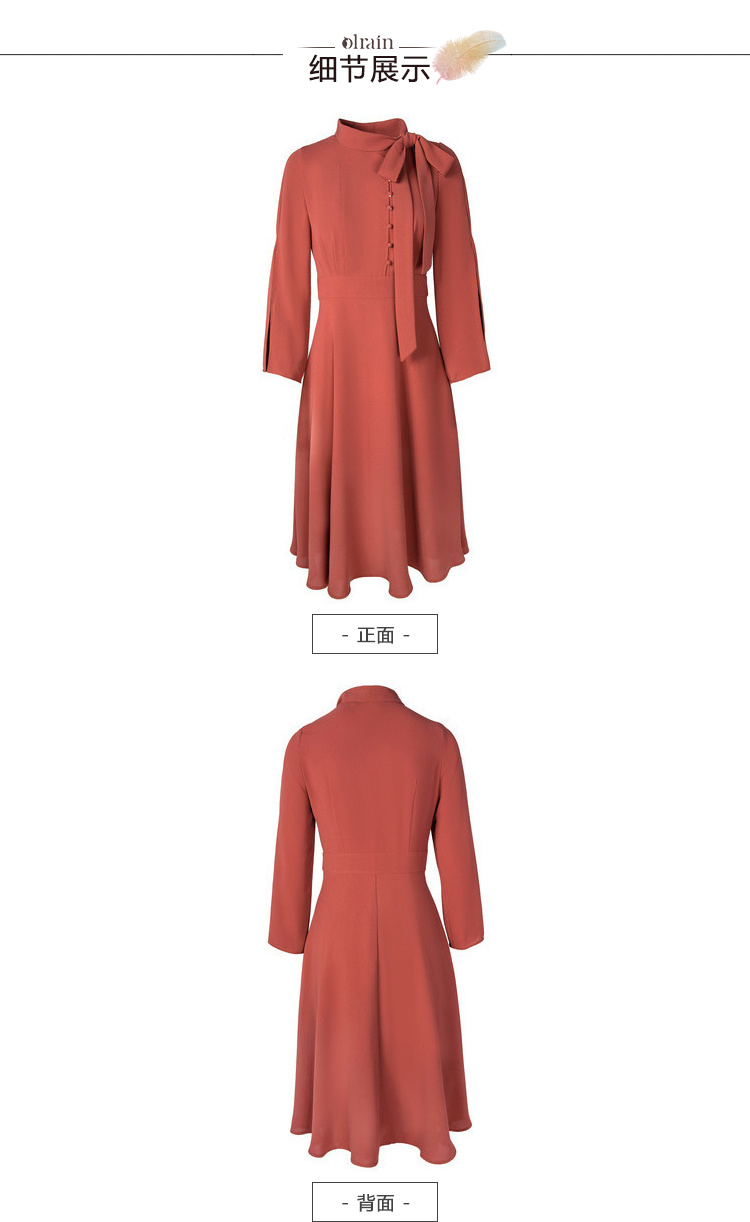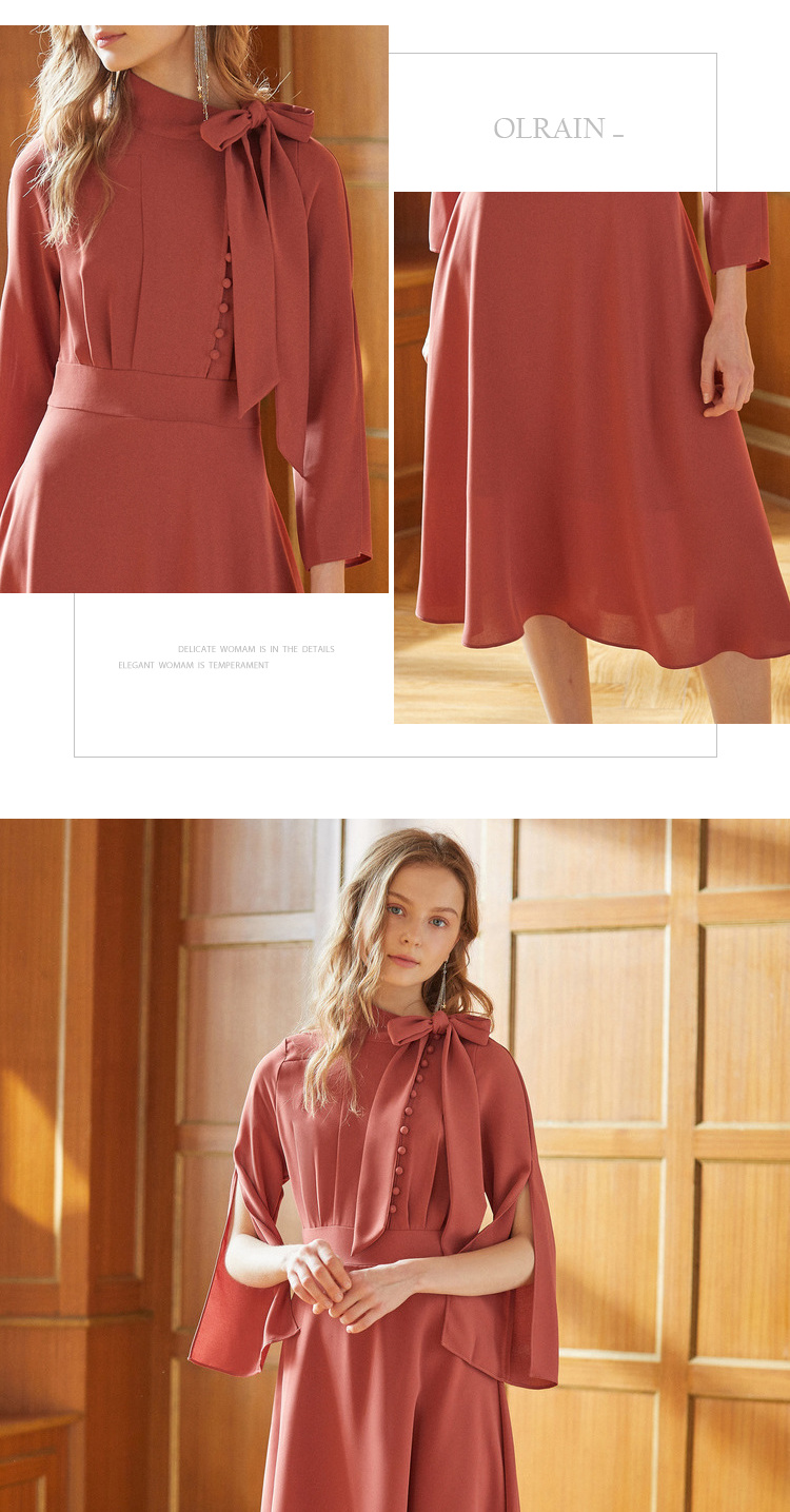 欧芮儿女秋装2018 长袖连衣裙红色收腰显瘦a字裙蝴蝶结中长
