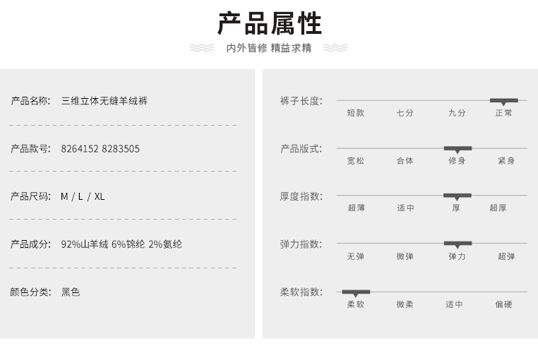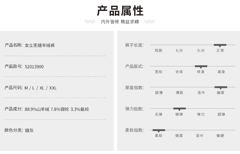 | 裤长: 长裤 | 材质成分: 山羊绒(羊绒)92% 聚酰胺纤维(锦纶)6% 聚氨酯弹性纤维(氨纶)2% |
