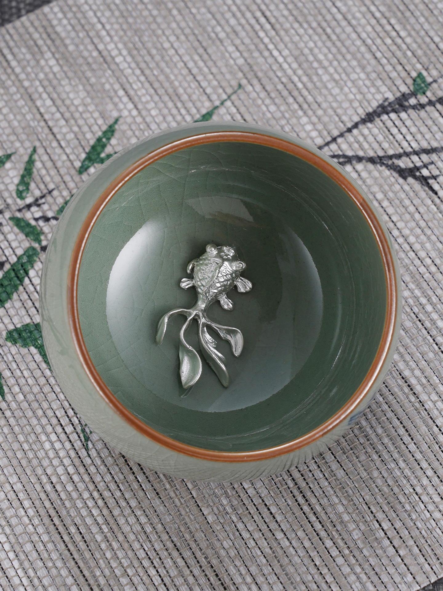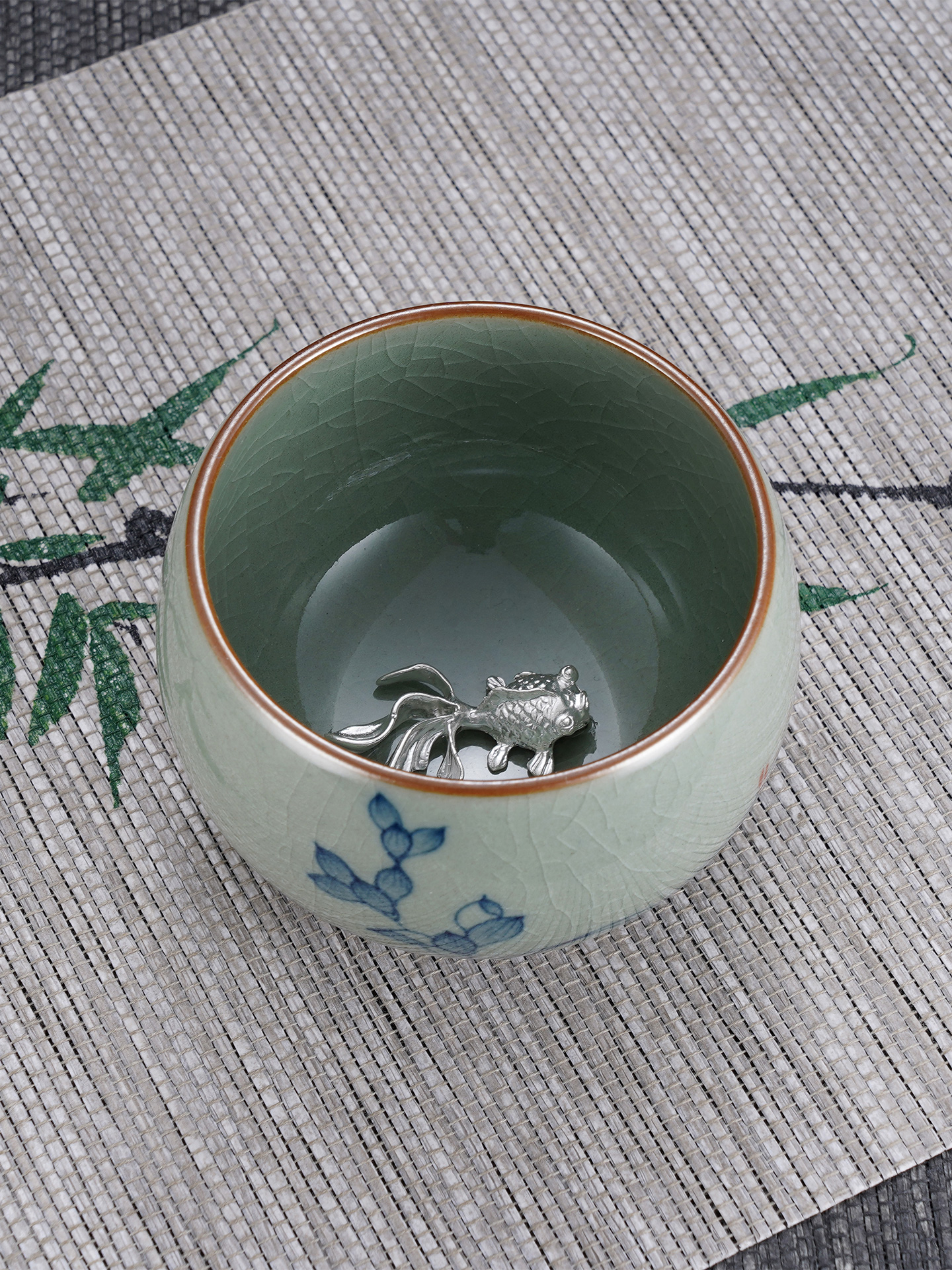 子佩集S990【幽兰芳华】摆件【SR002】纯银茶具冰裂纹梅兰竹菊茶杯-金鱼景德镇手绘2508