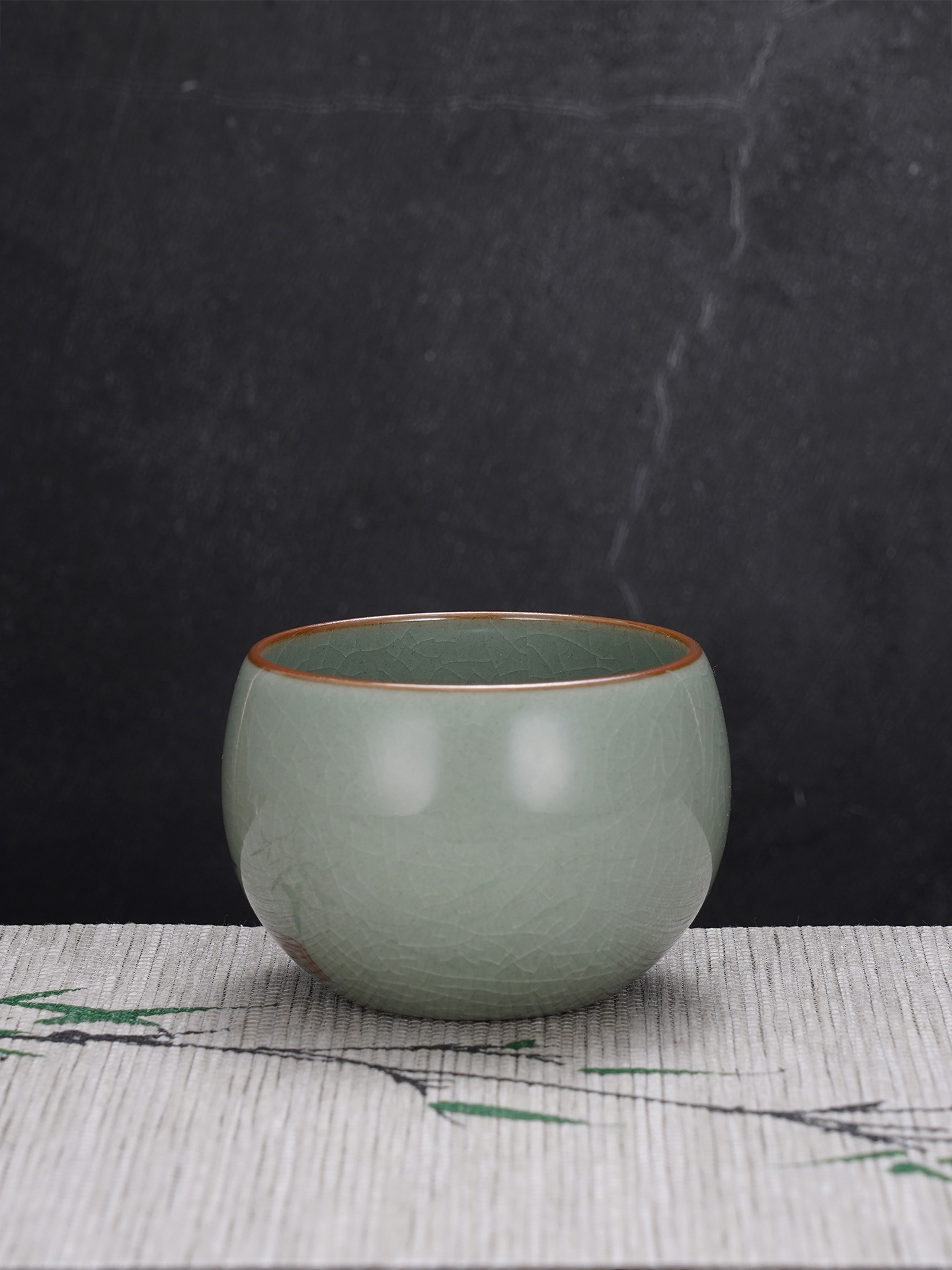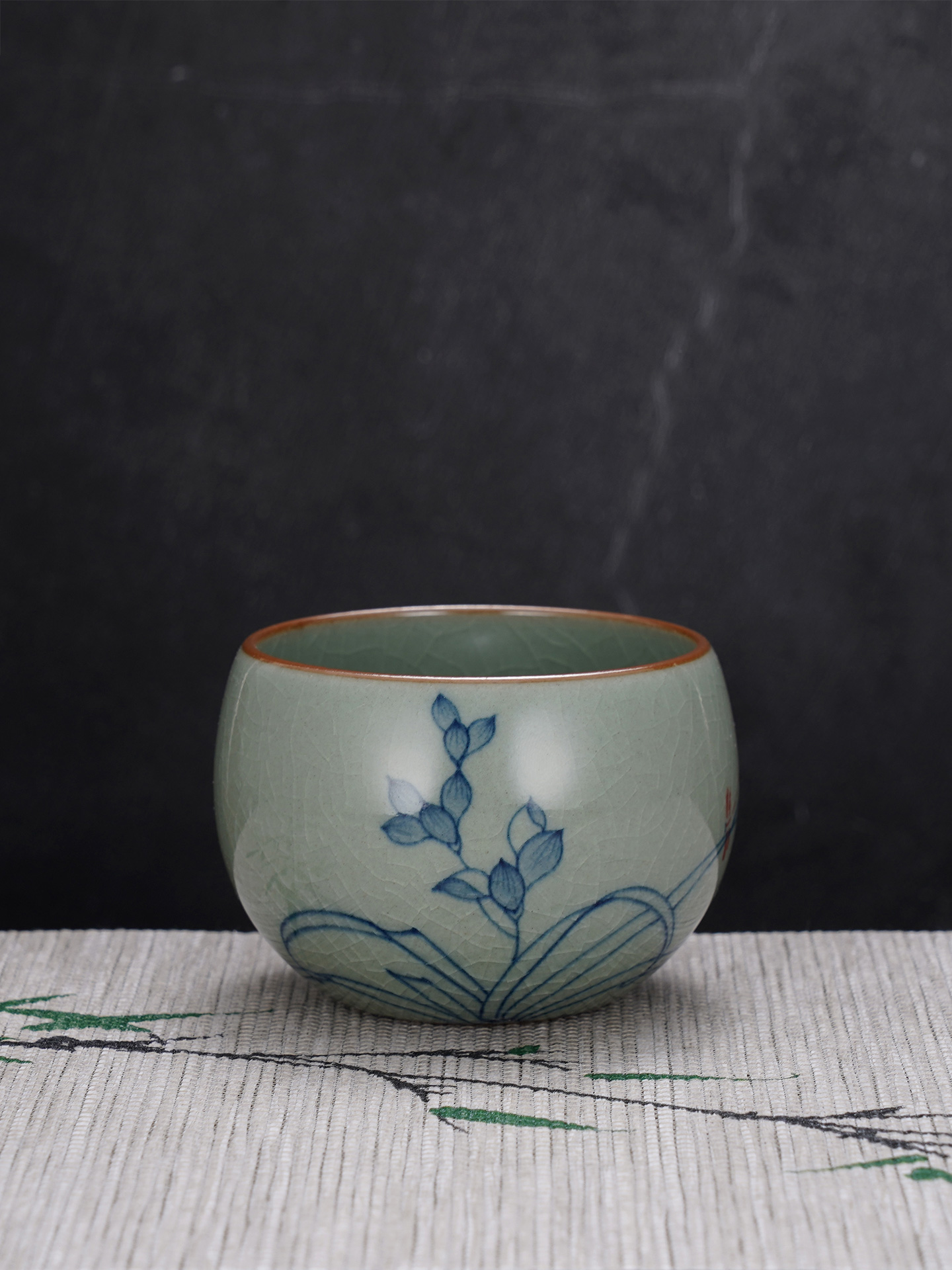 茶杯取意“花中四君子”之兰,青花墨韵勾画幽姿,杯底巧嵌金鱼,喻示雅致富贵、金玉满堂。