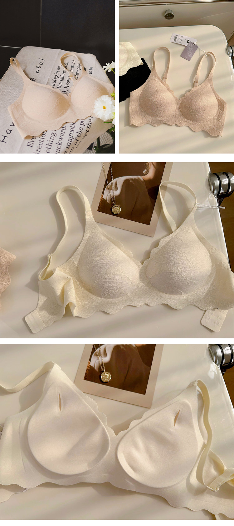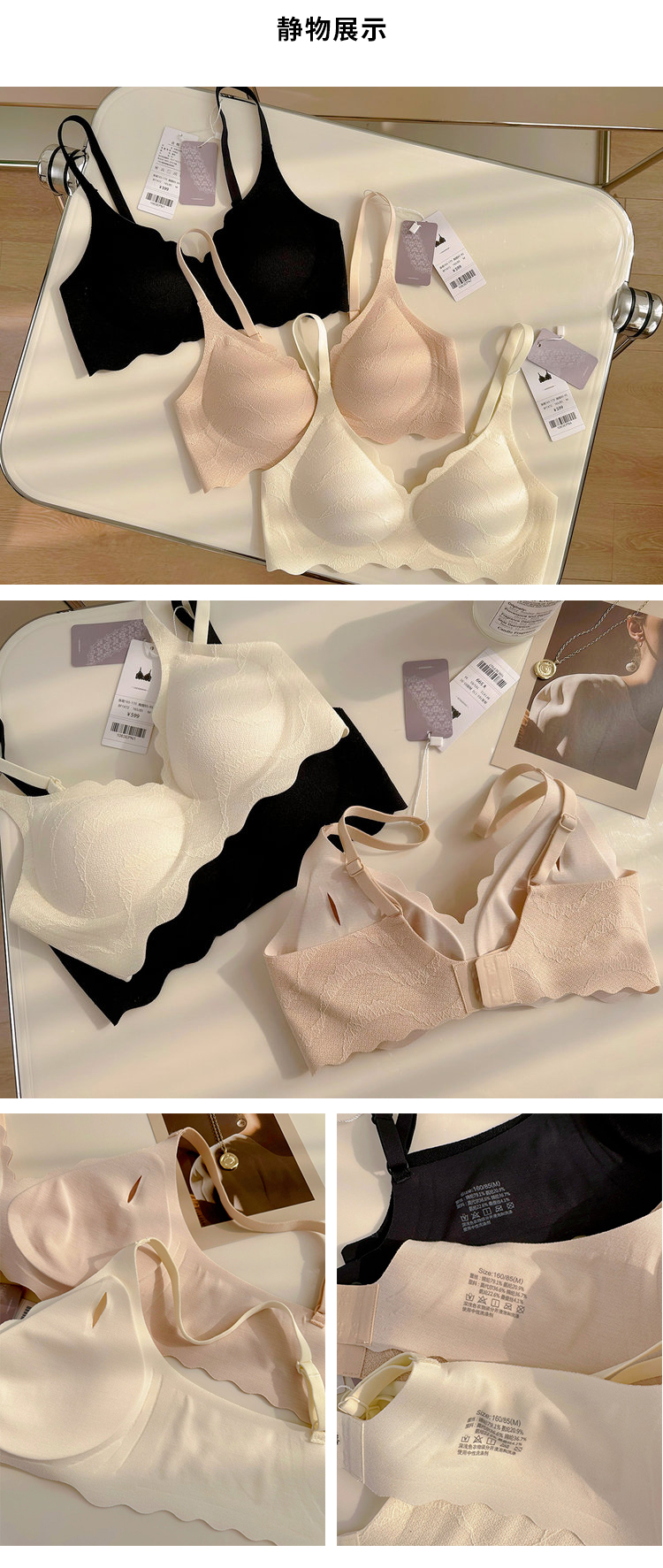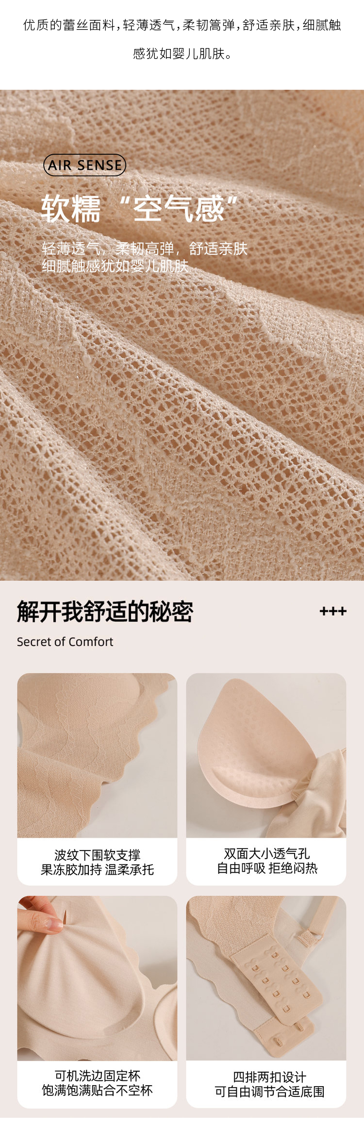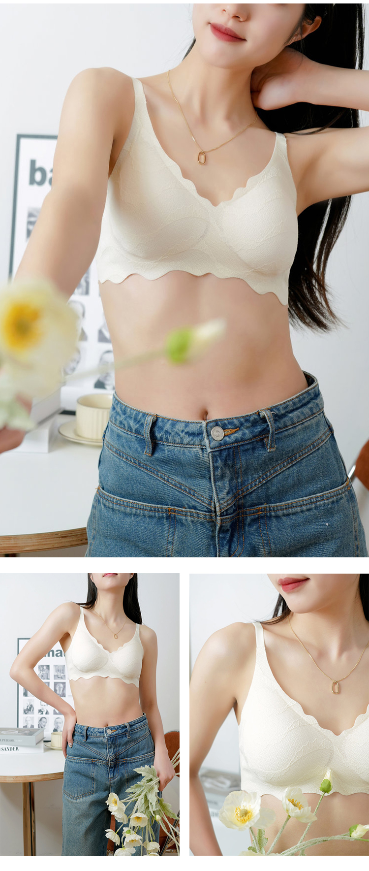 云朵般柔软 果冻胶无钢圈支撑 花面法式波浪边文胸 蕾丝杯面 轻薄透气 蚕丝内里