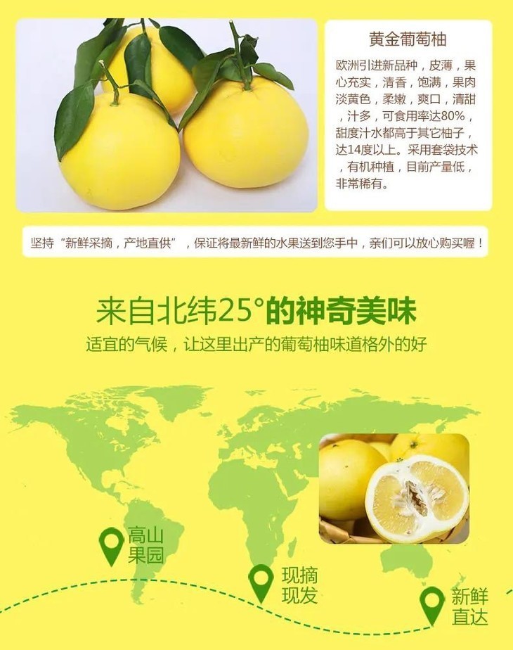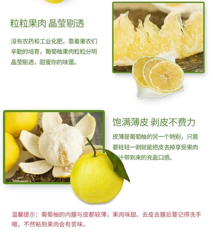 【产品规格】葡萄柚4.5-5斤(4-7个);葡萄柚8-8.5斤(7-11个);葡萄柚礼盒7-7.5斤(7-9个送榨汁机);青皮葡萄柚8-8.5斤(7-11个);葡萄柚礼盒7-7.5斤(7-9个送榨汁机);葡萄柚二级果8斤(6-10个,二级果外皮瑕疵,其他和精品果无差别)