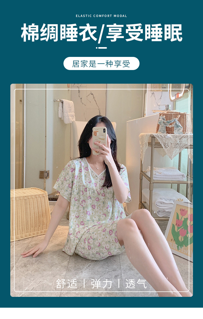 【休闲时尚!舒适感足】新款棉绸睡衣女夏季薄款短袖短裤家居服韩版甜美少女外穿大码套装。ry
