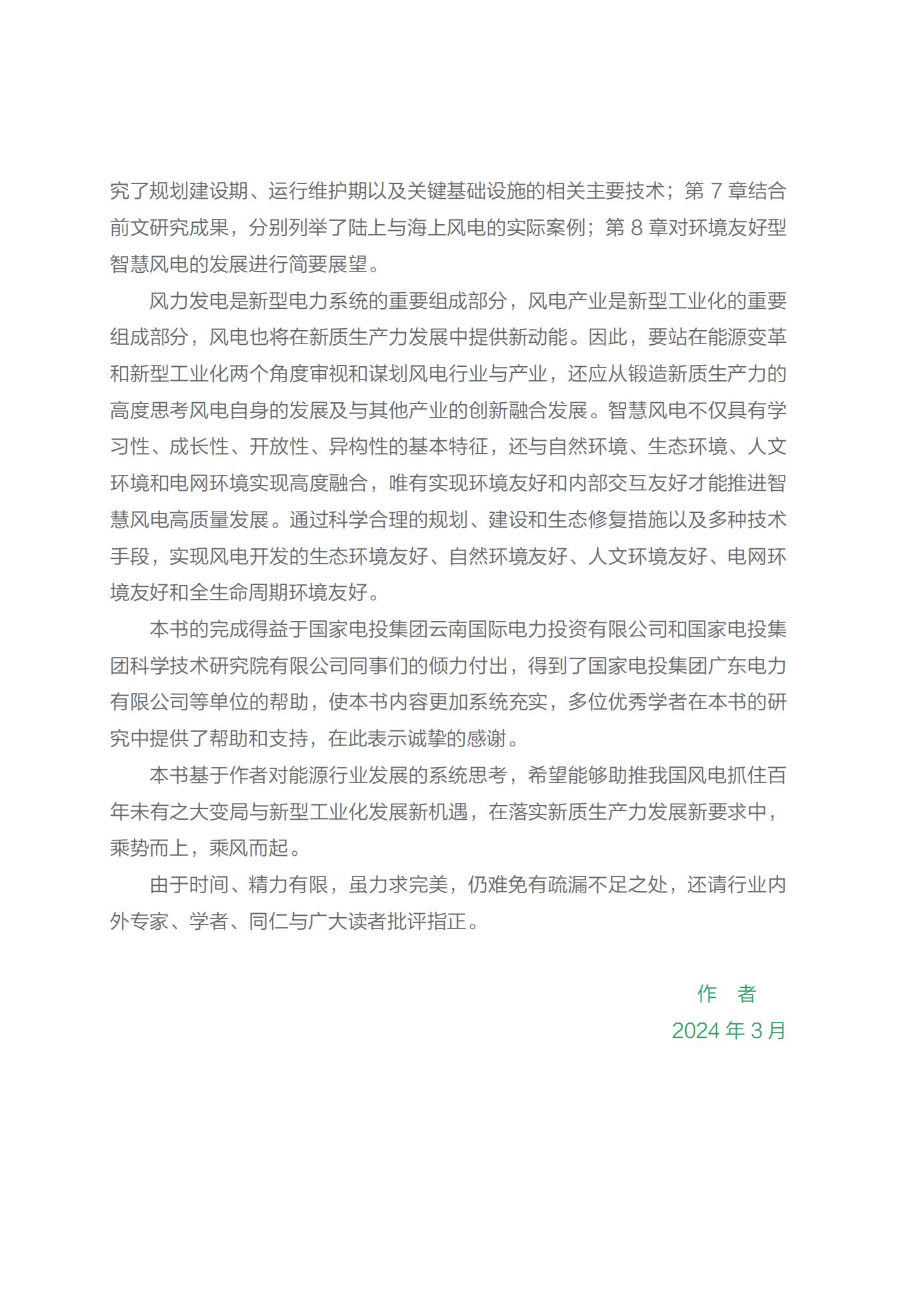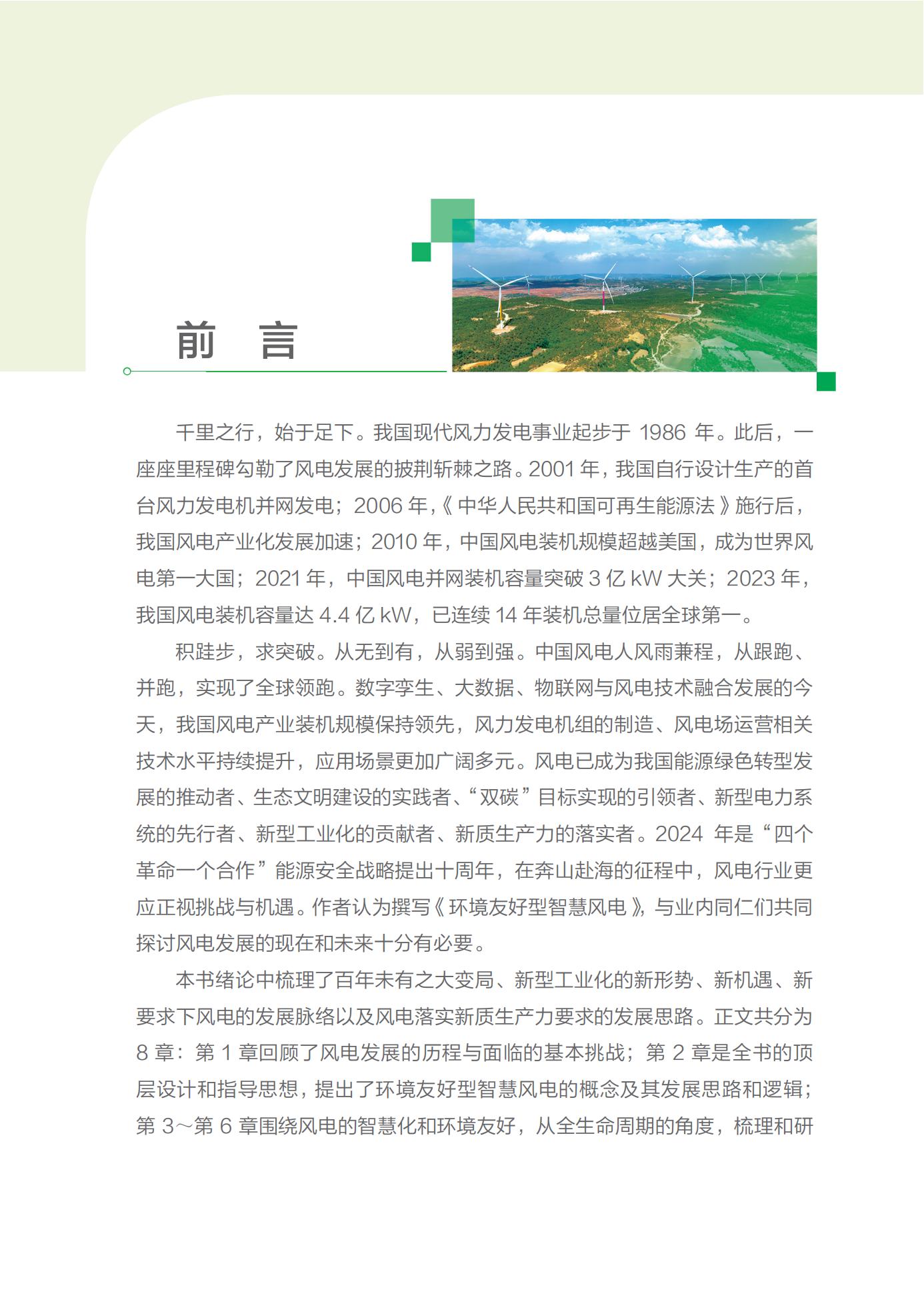 本书分析了百年未有大变局之下,风电在推进“双碳”目标与构建新型电力系统中的关键作用及落实好新型工业化与新质生产力发展要求的必要性,从我国可再生能源的发展现状出发,总结了风电发展对可再生能源行业的影响,分析了风电发展面临的技术挑战,在此基础上提出环境友好型智慧风电的基本概念与发展思路,结合实际案例,从全生命周期角度系统介绍了相关技术并简要展望环境友好型智慧风电的发展趋势。