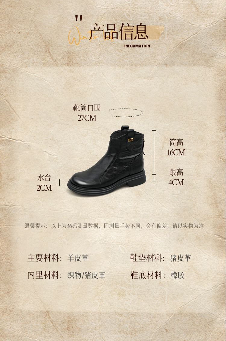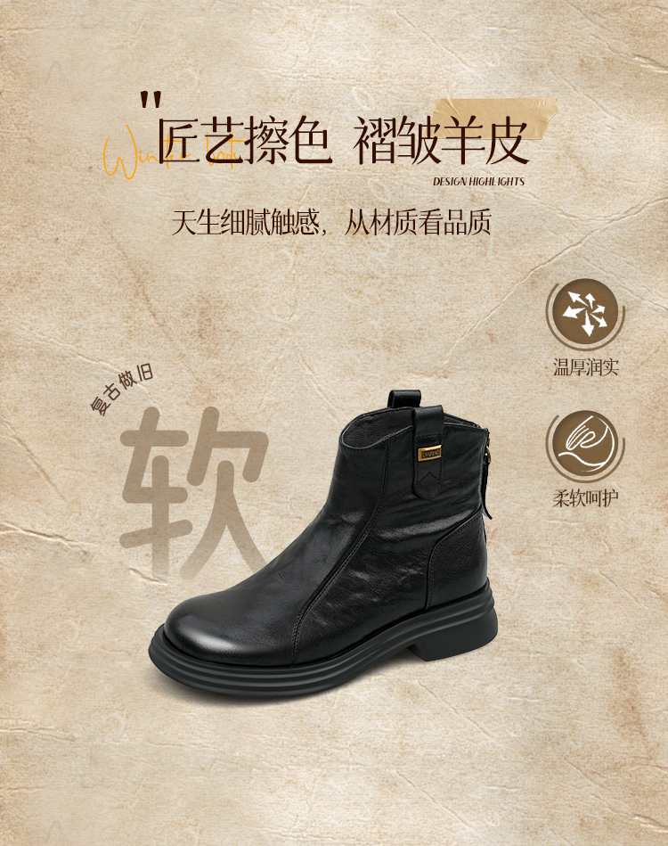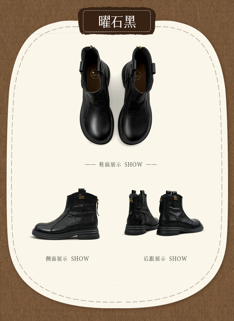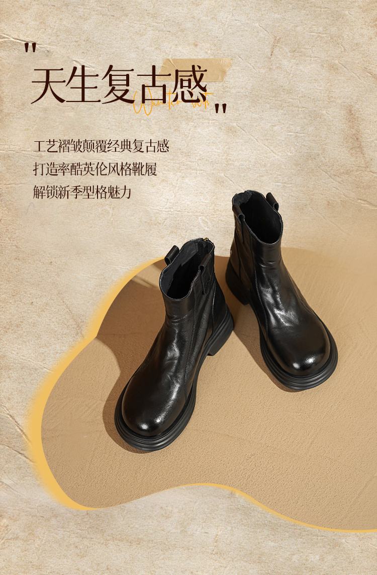 Safiya/索菲娅2025羊皮褶皱英伦风粗跟厚底百搭圆头显瘦短踝靴SFD4116013/SFD4118013