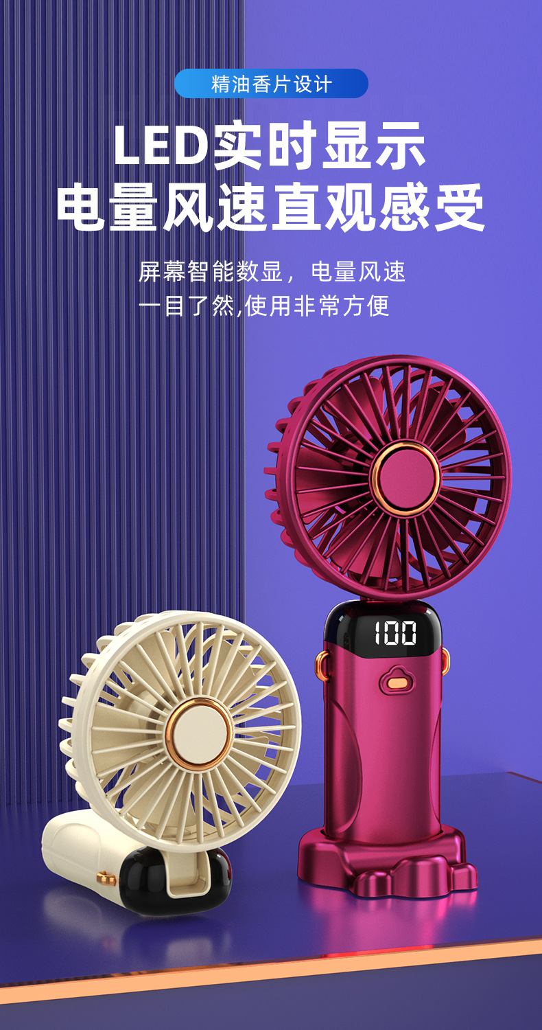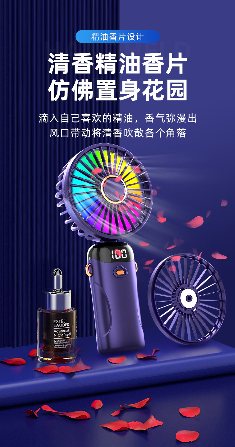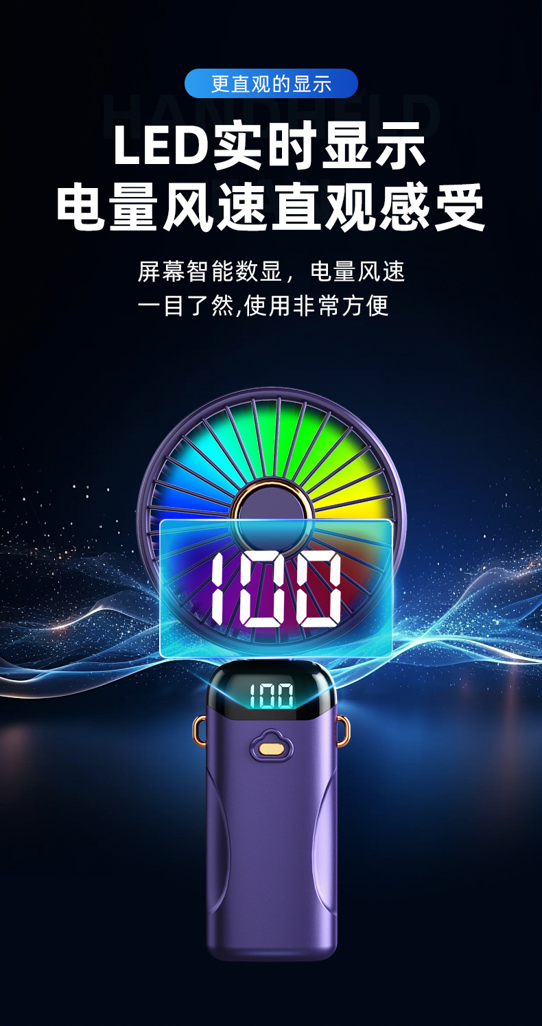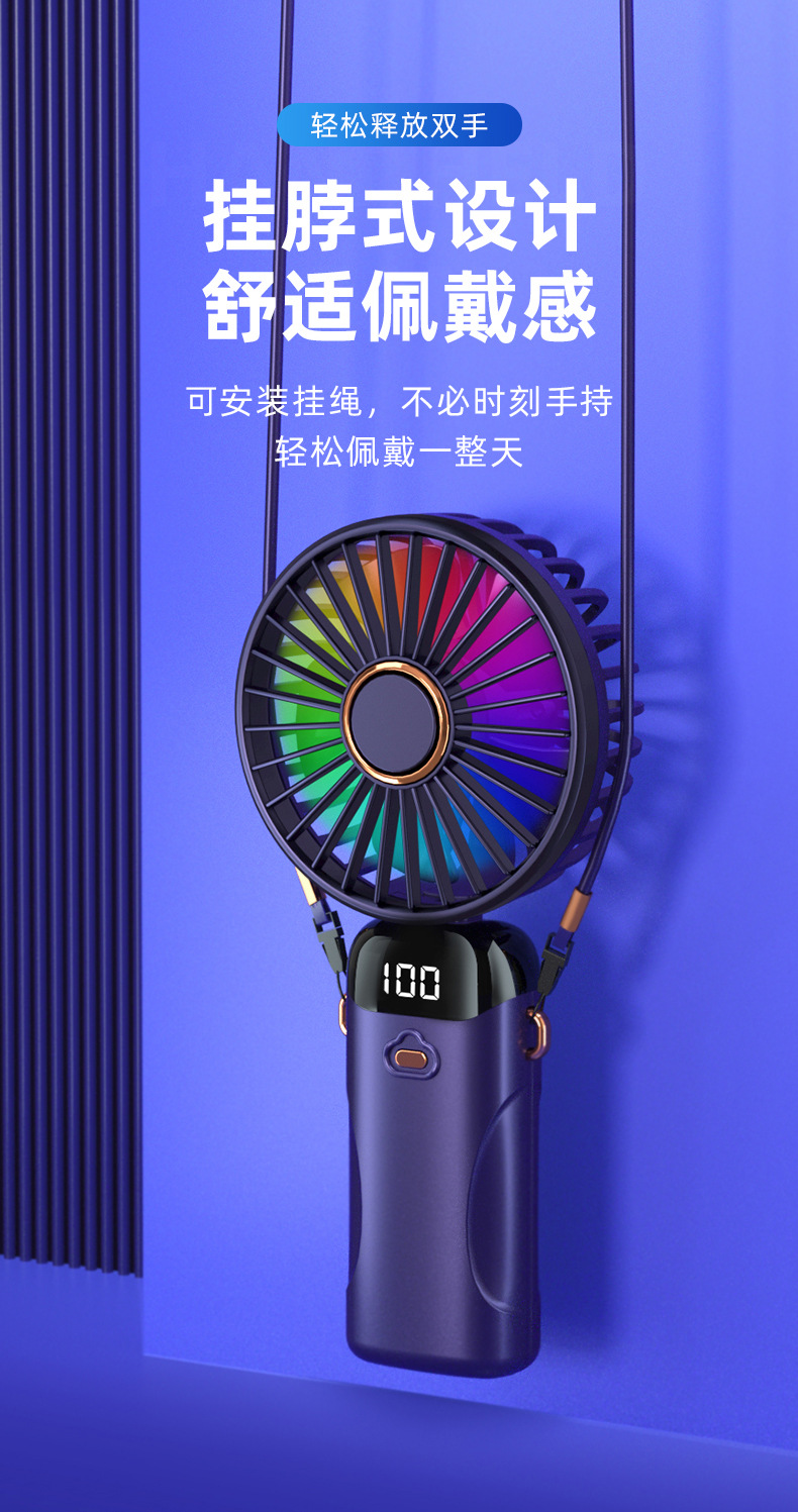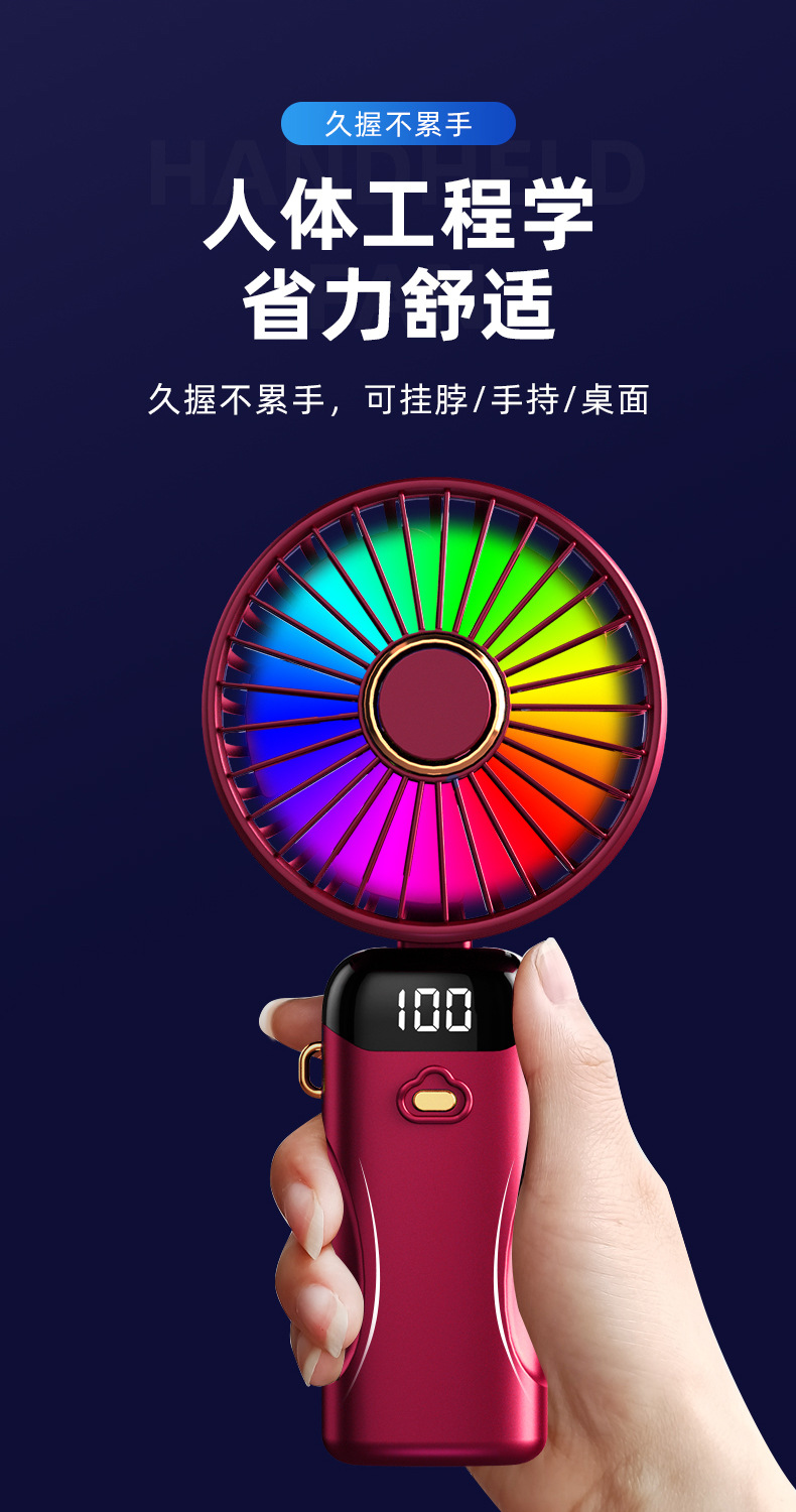 「七彩风扇!智能数显」新款手持折叠小风扇 usb迷你便携风扇大风力数显多功能挂脖小风扇生活电器