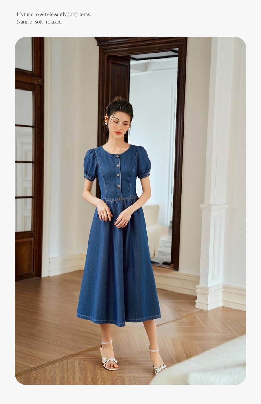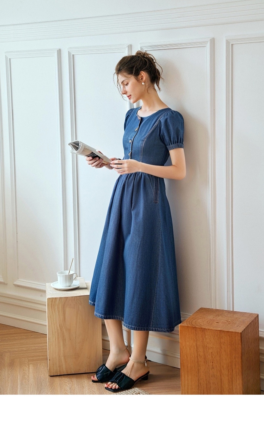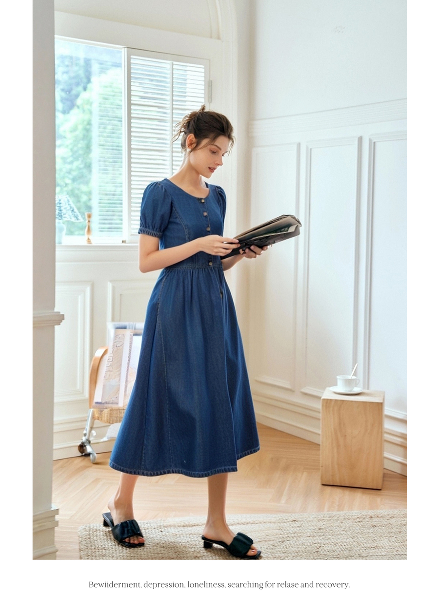 OLrain欧芮儿蓝色短袖收腰连衣裙女夏季2025新款显瘦法式牛仔长裙
